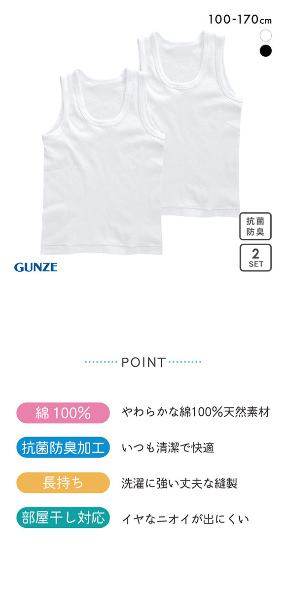 グンゼの男の子用肌着です。無地のクルーネックランニングシャツ、2枚セットです。オールシーズン対応でやわらかくサラっとした風合いの綿100%素材です。