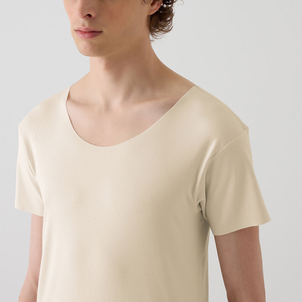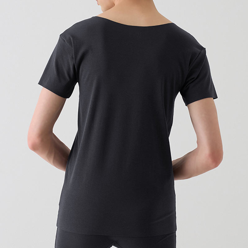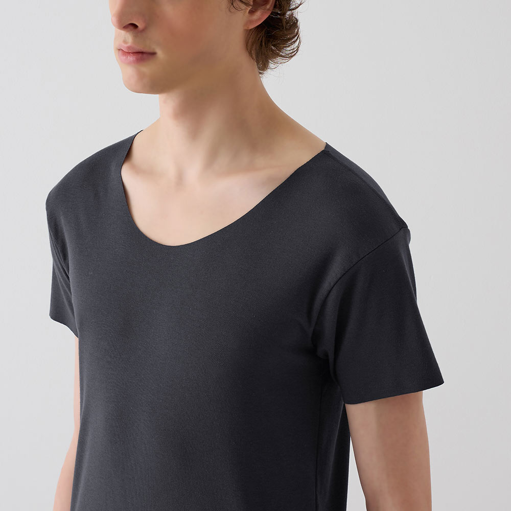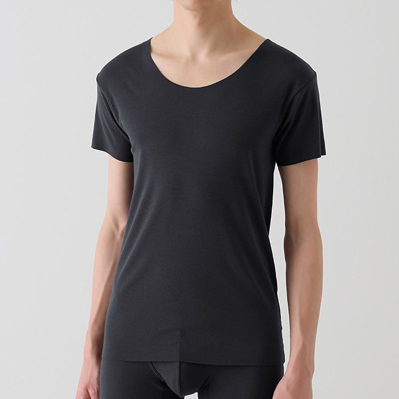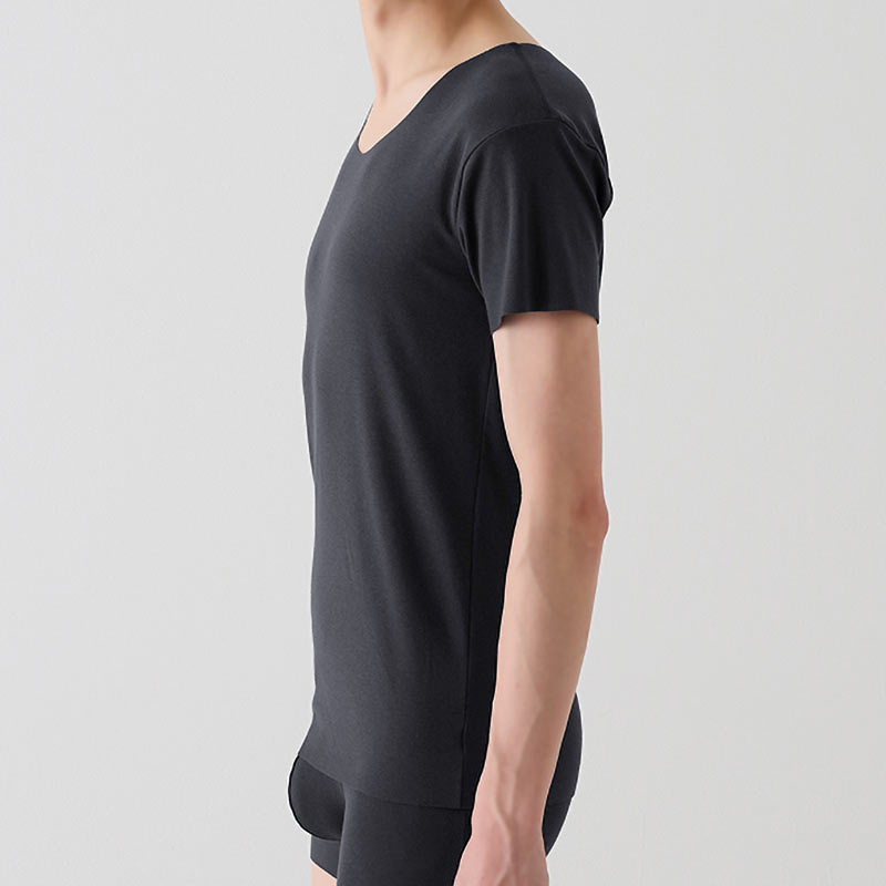 吸湿性の高い綿レーヨン素材を使用し、さらっとムレにくい。生地端は縫い目のないカットオフ仕様で快適にご着用いただけます。