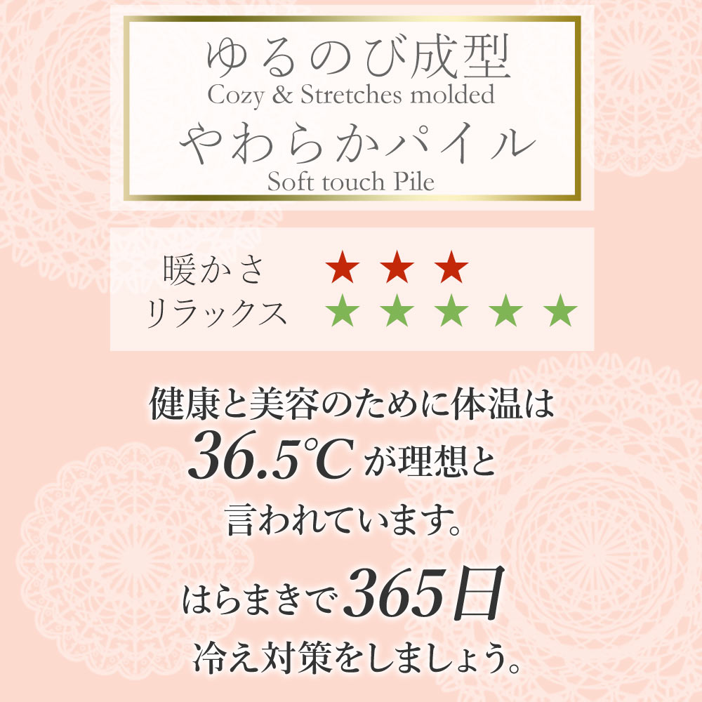 ゆる~く、柔らか~く伸びて、身体にやわらかフィットする腹巻。内側はふわふわパイルで優しい付け心地。身体の丸みに合わせた立体成型設計で身体を優しく包み込み、脇縫い無しで優しい肌あたりです。