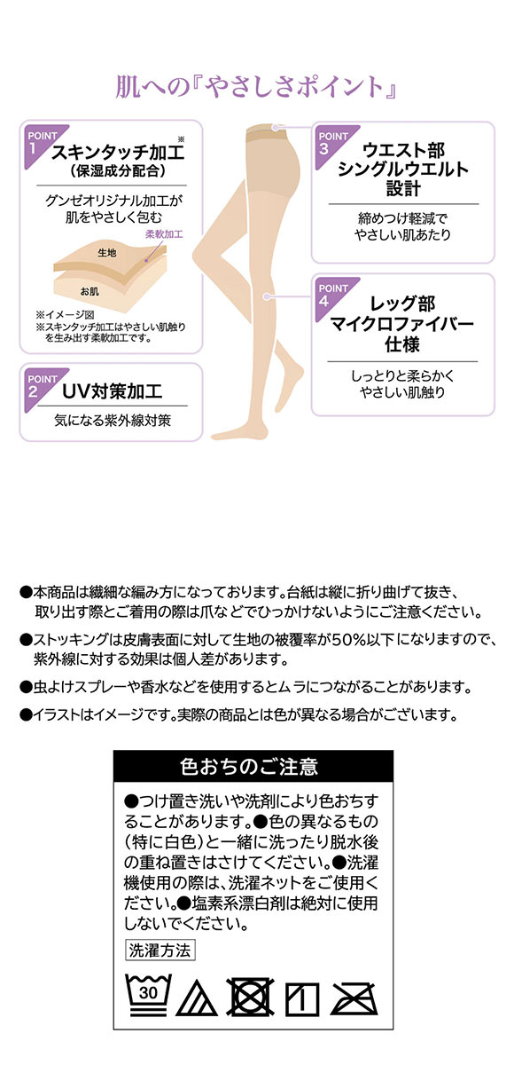 保湿成分を配合したグンゼオリジナルの「スキンタッチ加工」でお肌をやさしく包み込みます。ウエスト部は締め付けにくい設計で、レッグ部はしっとり柔らかいマイクロファイバー仕様でやさしい肌ざわりです。