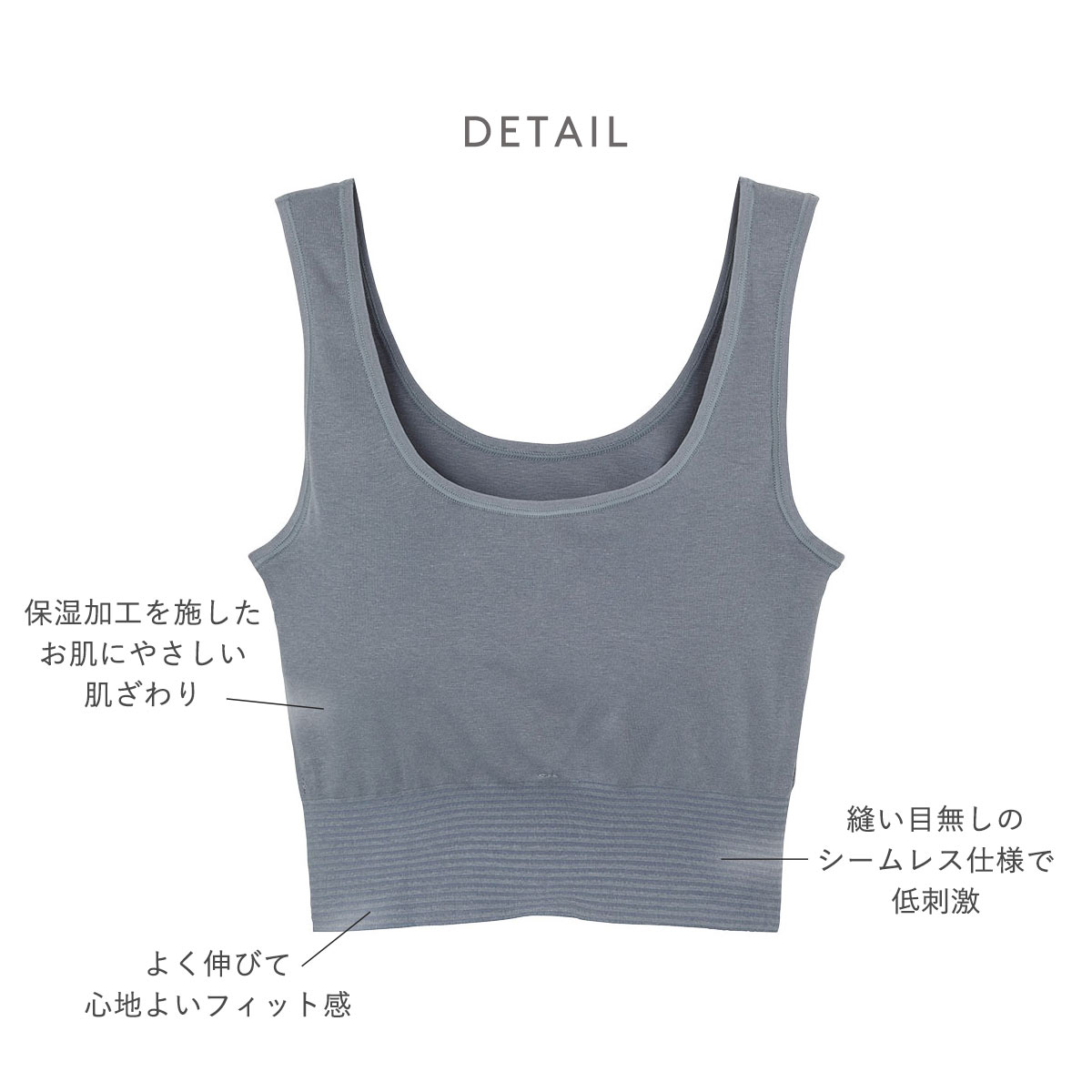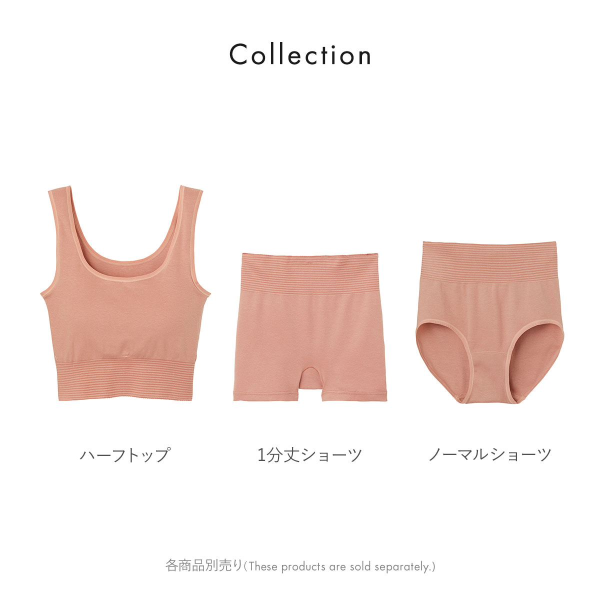 おうちでの時間をより快適に過ごせる為のヒミツがたくさん詰まったハーフトップ。アンダー部分はとても伸びて縫い目のないシームレス仕様で、ズレ上がり・めくり返りを緩和し、心地よいフィット感。