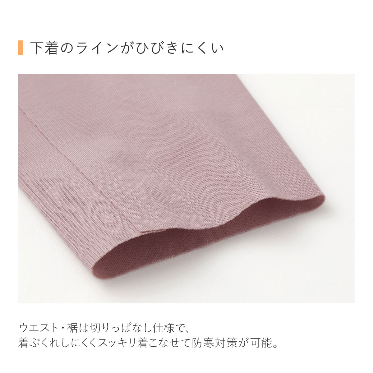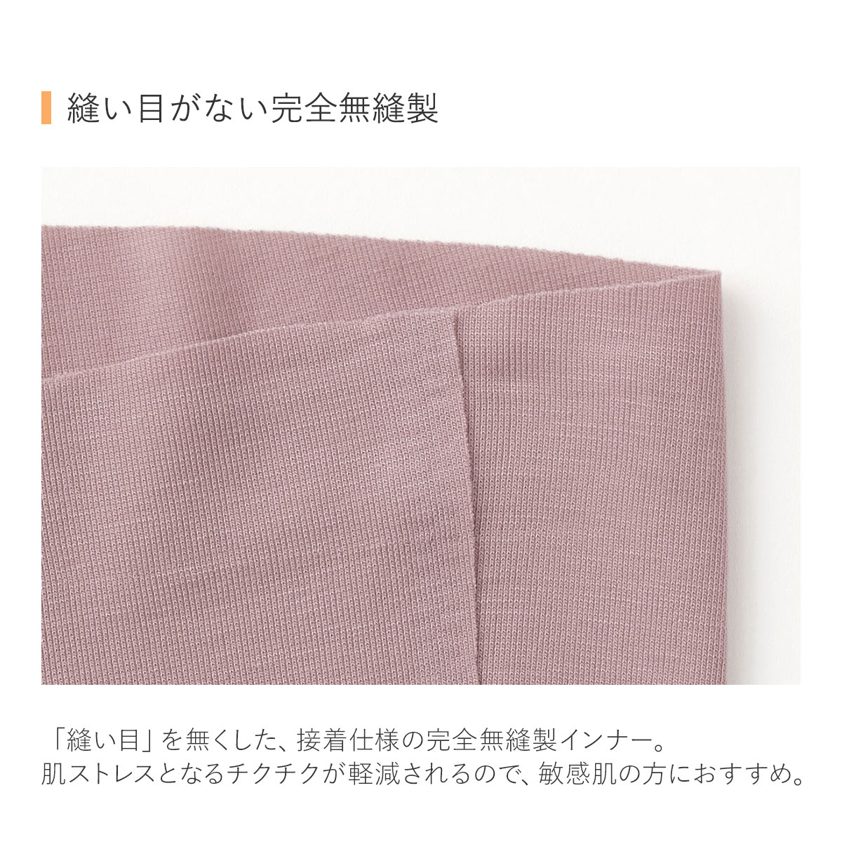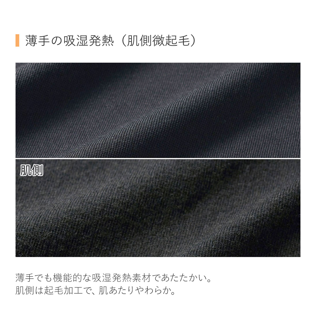 薄手でも吸湿発熱素材でポカポカ暖か。肌側は起毛加工で肌あたりがやわらか。縫い目のない接着仕様なのでストレスとなるチクチク感が軽減。