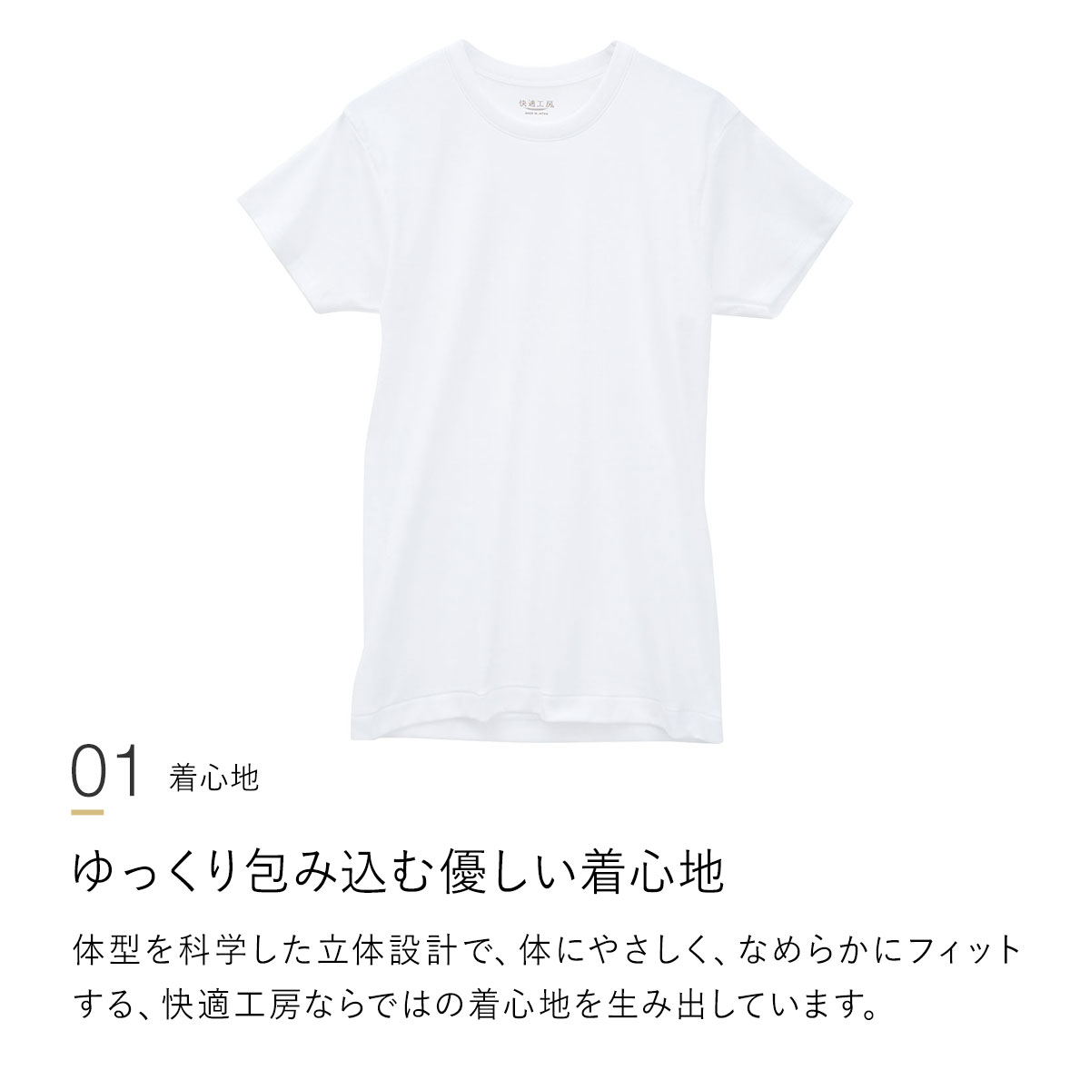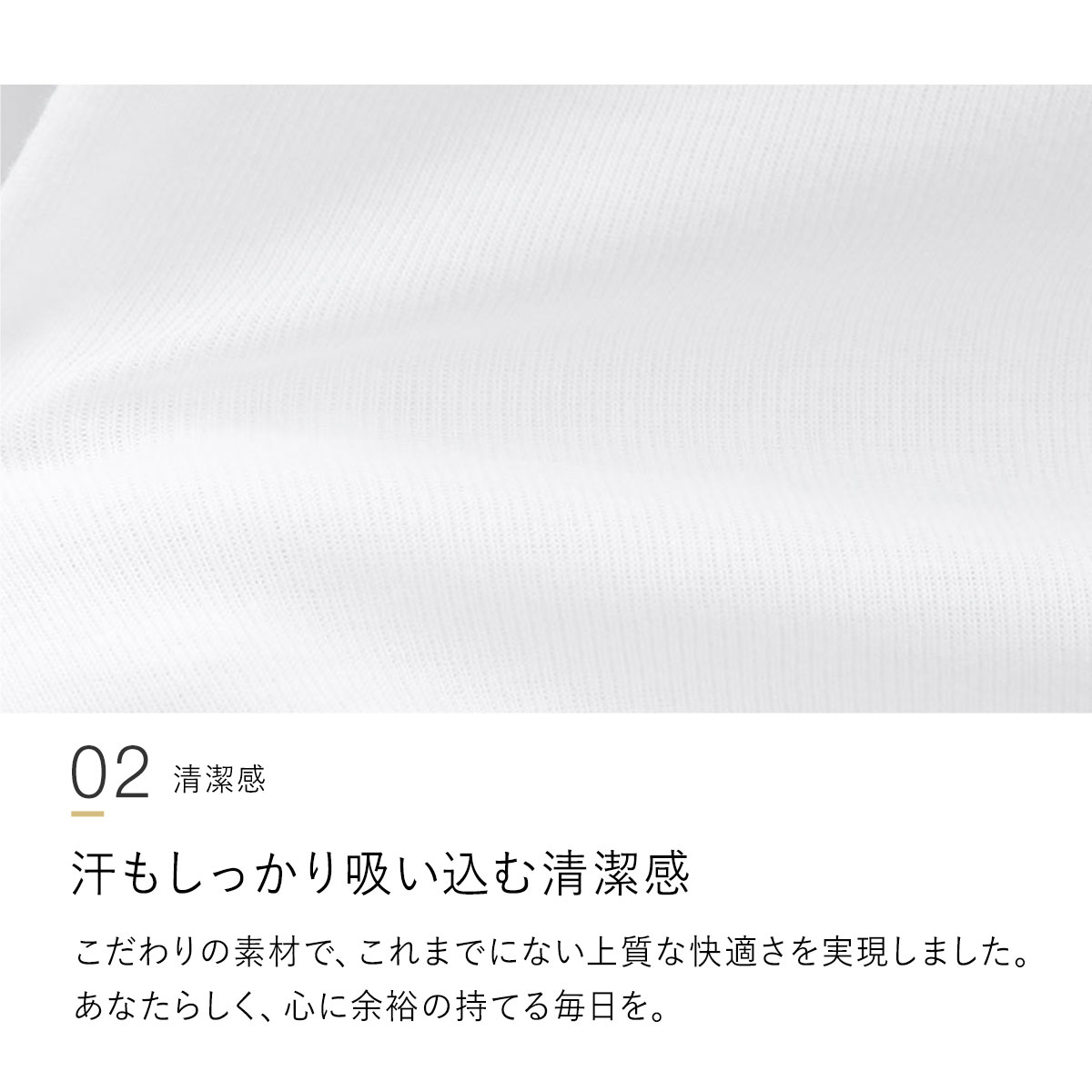 上質な快適をあなたに。肌をゆったりと包み込む着心地と嫌な汗もしっかり吸い込む清潔感で、これまでに無い上質な快適さを実現。