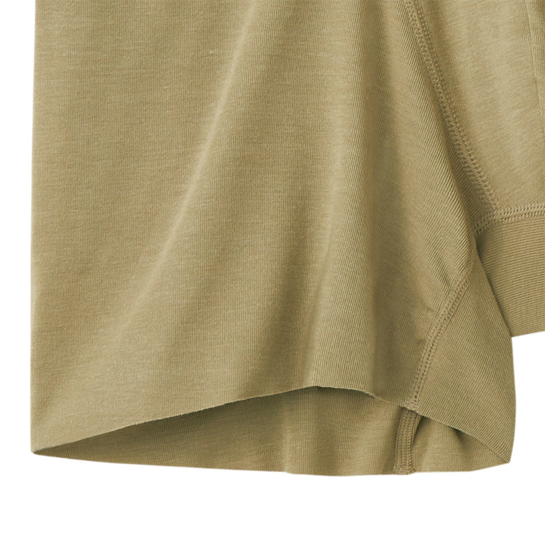 裾部分はきりっぱなし仕様(カットオフ)のため、風を纏うようなフラットな仕上がりで、アウターにひびきにくい。とろみ感のある滑らかレーヨン混素材を使用し、心地よい着用感を提供します。持続消臭加工でエチケット面にも配慮されたアイテムです。