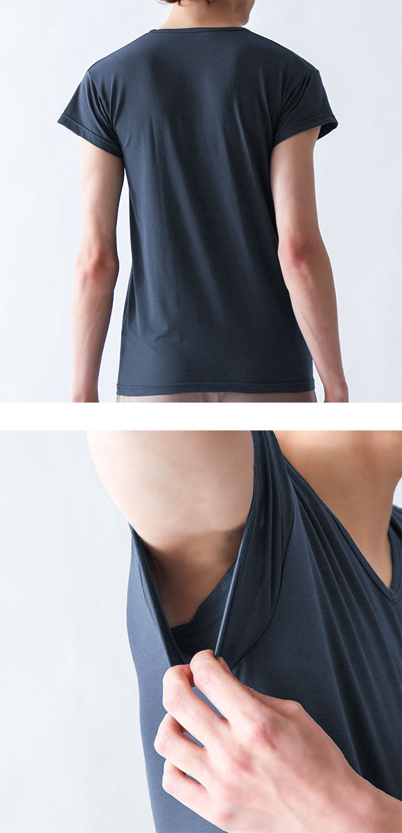 汗を瞬時に吸収し、素早く乾かす構造を再現。グンゼ最高クラスの吸汗速乾テクノロジー、アセドロンから不快な汗をサッ、シュッ、パッと瞬時に拡散する汗取り付きVネックTシャツが登場しました。