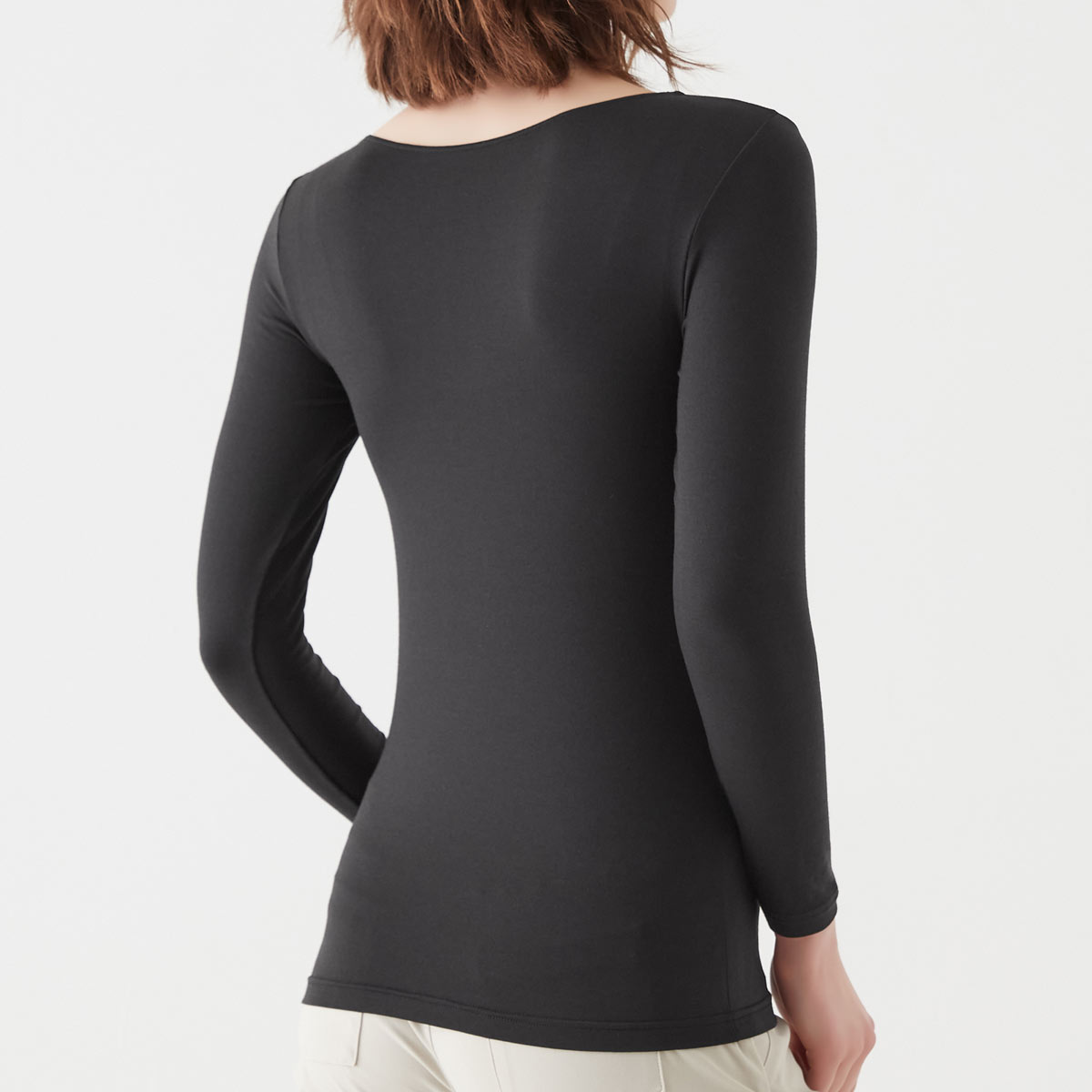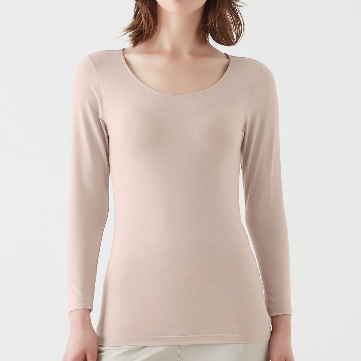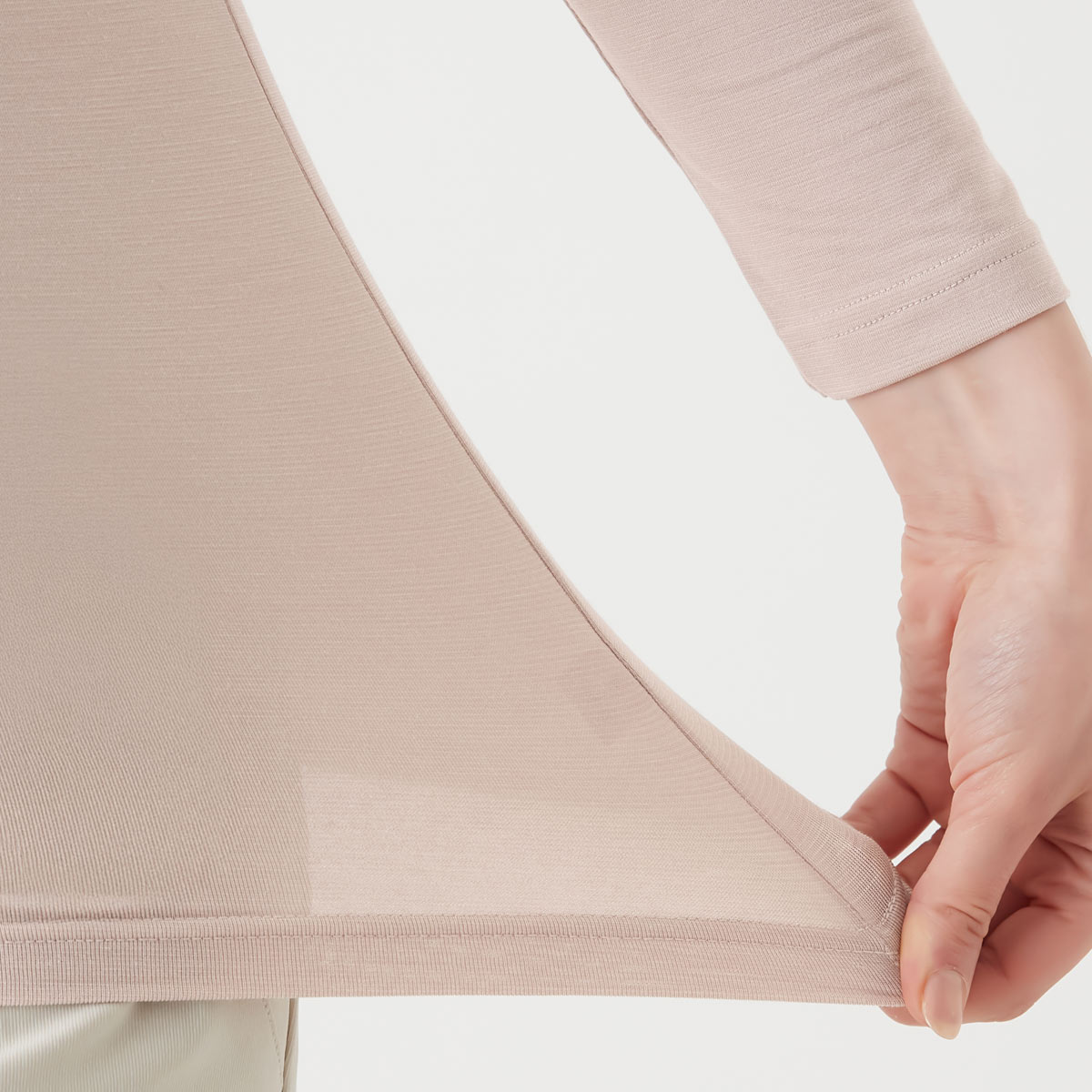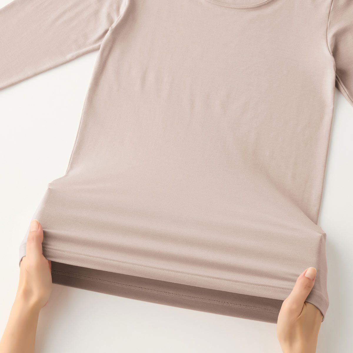 驚きの軽さと薄さ タイトな服の下でもシルエットに響かず、肩こりしにくい軽量設計。秋口から春先まで長く使えます。汗をかいても「冷えない」 吸放湿性に優れ、暖房の効いた室内での汗ムレや、その後の汗冷えを徹底ガード。1日中さらさらの肌触りが続きます。効率的な「吸湿発熱」 身体から出る湿気を熱に変え、薄手ながらもしっかりとしたぬくもりをキープします。使い勝手の良い「8分袖」 アウターの袖口からはみ出しにくく、手元がスッキリ見える絶妙な丈感です。