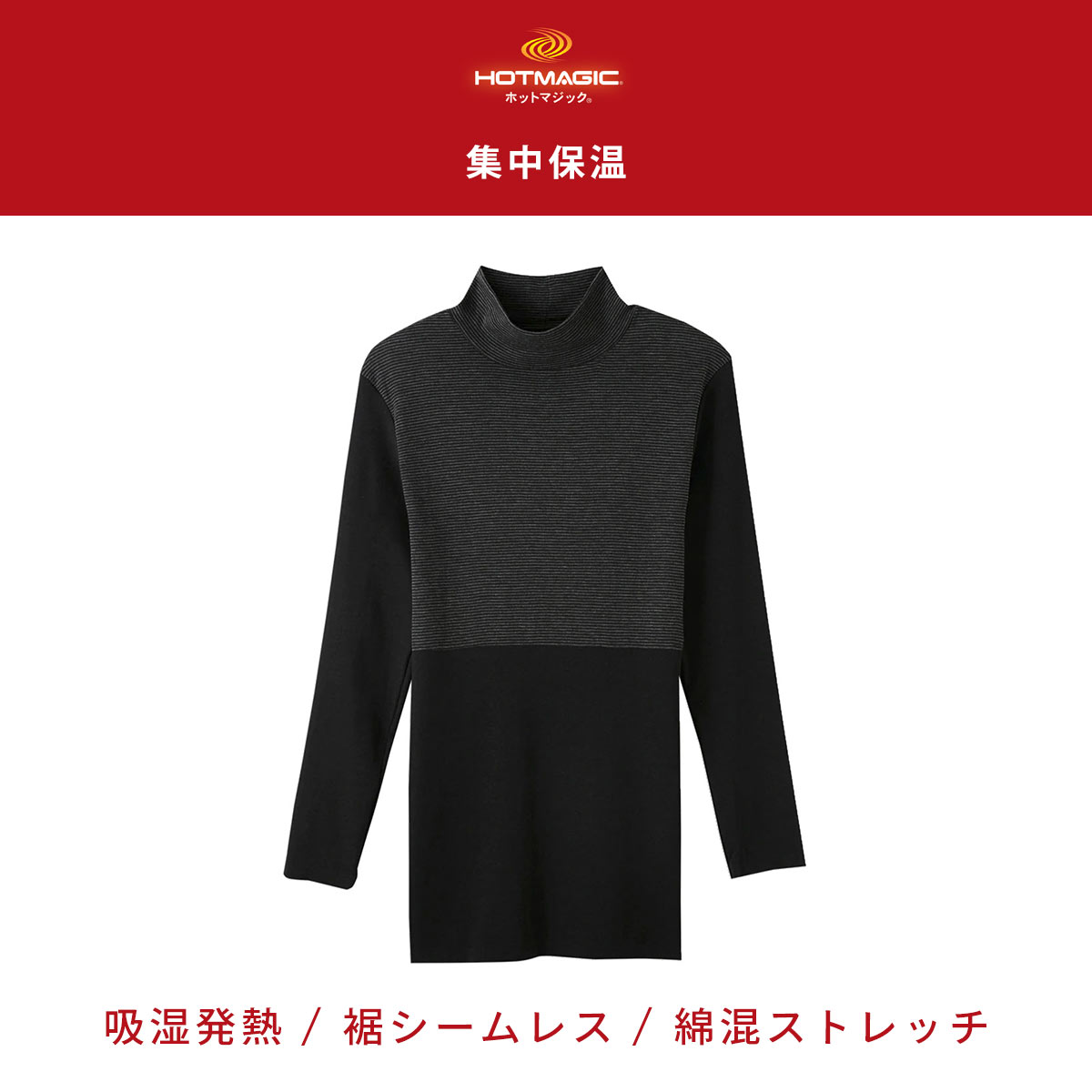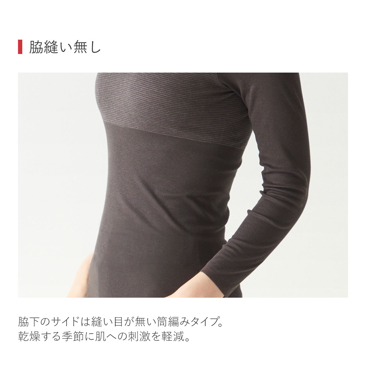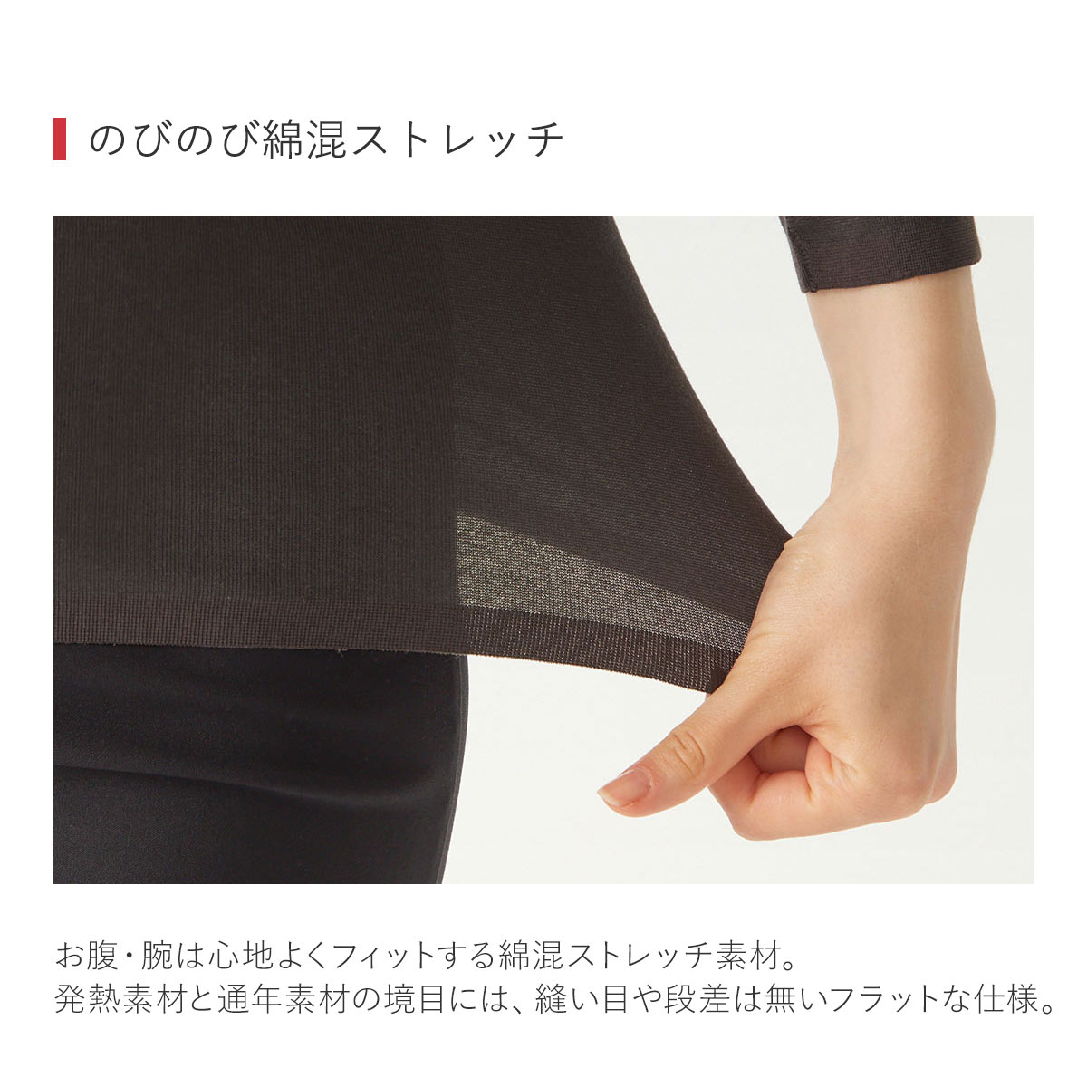 冷えのポイントを暖める凄インナー!ボーダー部分に吸湿発熱繊維を使用。冷えのポイントを集中的に暖め、全身をほどよい暖かさに保ちます。袖口・裾に縫い目が無く、ごろつきにくいシームレス仕様。薄手でひびきにくいから、すっきり着こなせます。お腹・腕は心地よくフィットする綿混ストレッチ素材。縫い目の刺激も少なく、肌に優しい仕上げにしています。