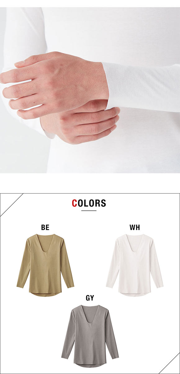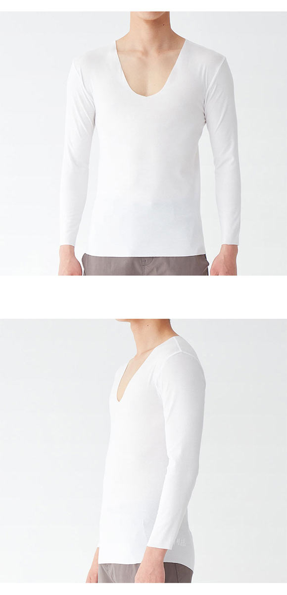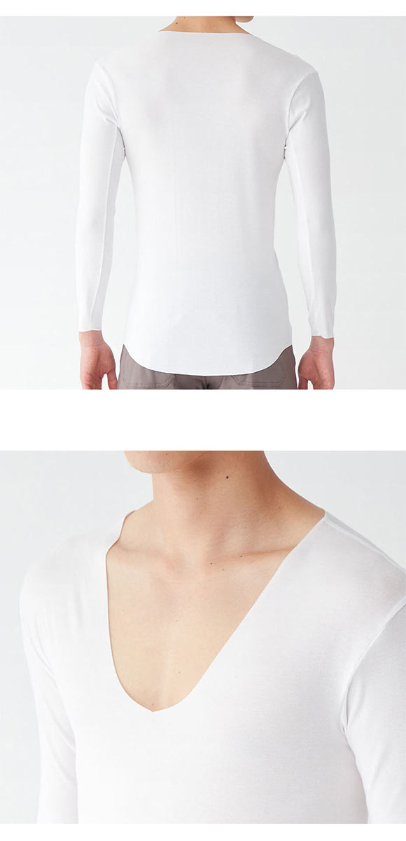 ドレスシャツやポロシャツの襟元からインナーが覗きにくいネックライン仕様と、後ろ丈長めで、かかんでも背中が見えにくい独自の立体設計パターンに仕上げました。