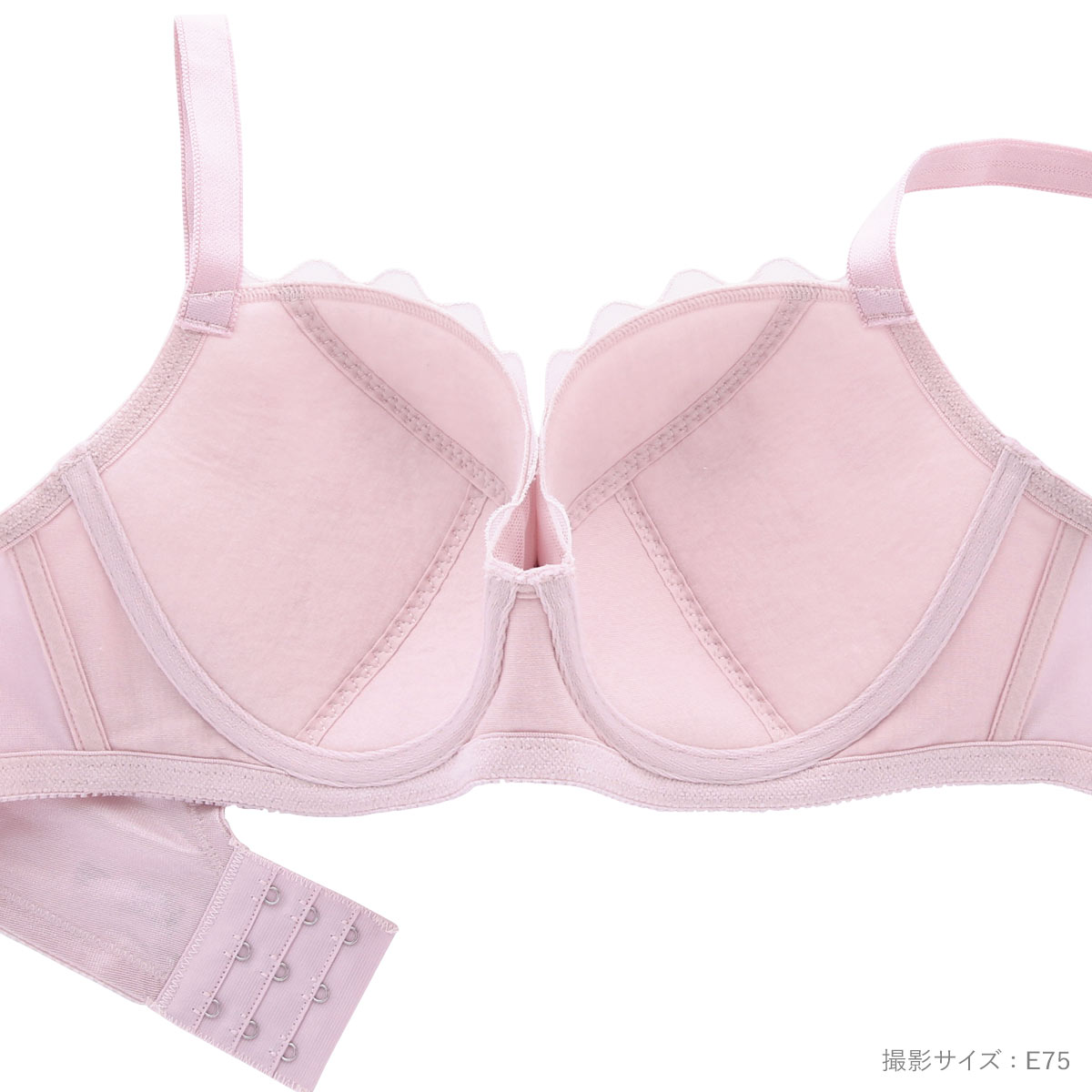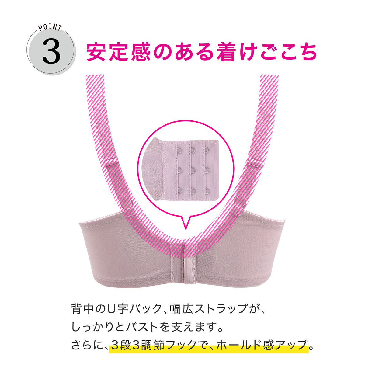 カップはバスト全体を優しく包み込みながら、美しく持ち上げキープする4/5カップブラ。安定感があり、しっかりとバストを支えます。脇高設計で脇と背中を幅広くカバーしながら、サイドボーンで脇流れをおさえすっきりシルエットに整えます。