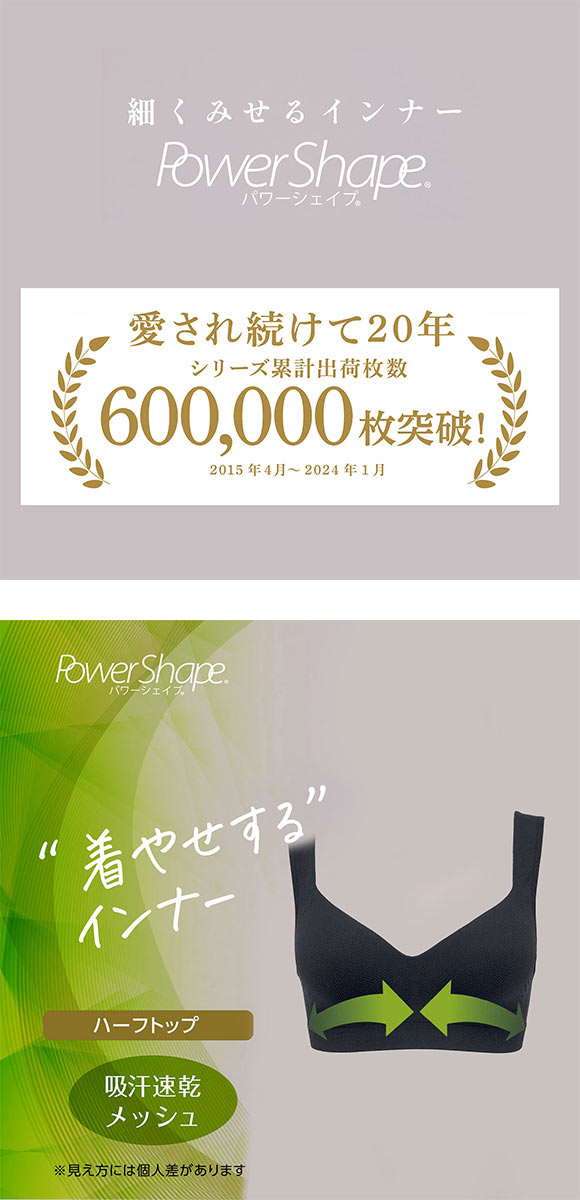 下から上にはいて整う、つけた瞬間くびれをメイク!美姿勢サポートインナー。着るだけでキュッとスリムを実感できるPowerShape(パワーシェイプ)細くみせるインナーカップ付き成形ハーフトップインナーです。