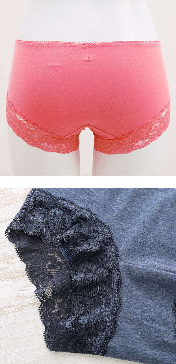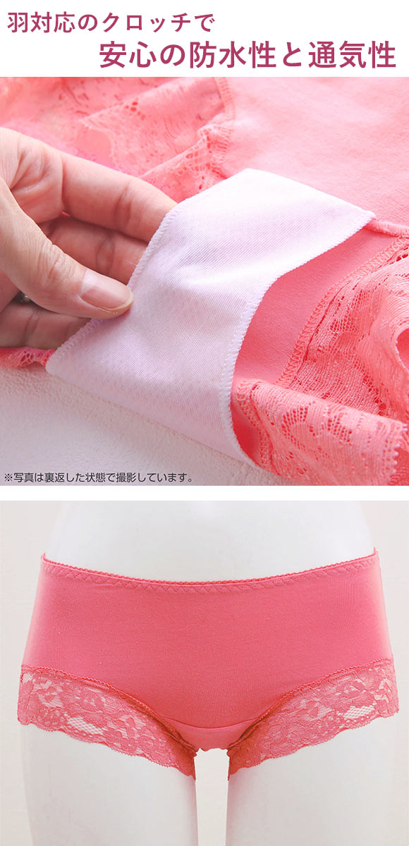 身生地は綿混素材でとても柔らかく、伸縮性があり、からだにフィット。肌の弱い方でも心配いらずです。足口は肌あたりやさしいストレッチレース仕様で、くいこみにくく、ひびきにくいのも嬉しいポイント。羽つきナプキンもご使用いただけます。