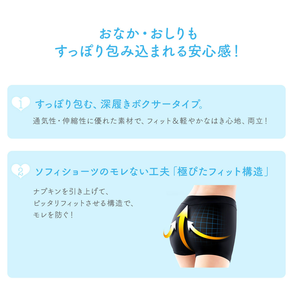すっぽり包み込む、深履きボクサータイプのサニタリーショーツです。