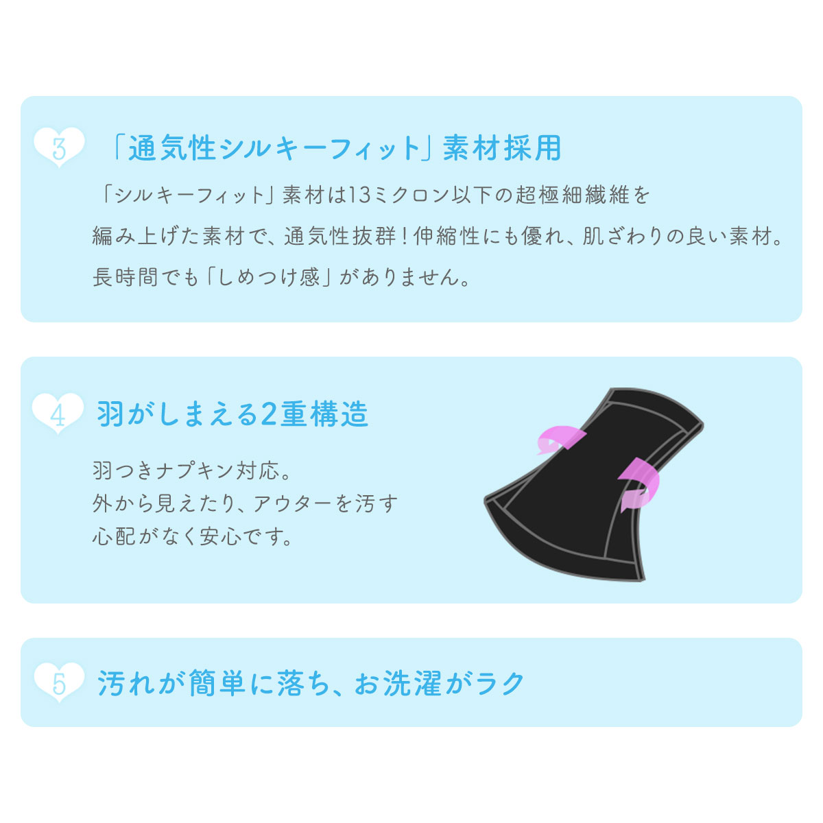羽がしまえる二重構造のクロッチで羽根つきナプキンにも対応。外から見えたり、アウターを汚す心配がなく安心です。汚れが簡単に落ち、お洗濯がラクなのも嬉しいポイント☆