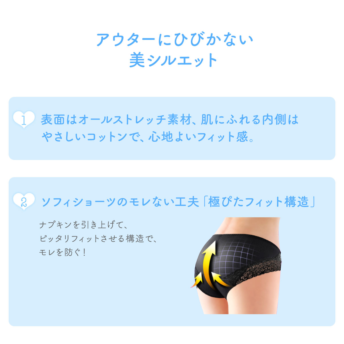 ソフィショーツのモレない工夫「極ぴたフィット構造」で、ナプキンを引き上げてぴったりフィットさせ、身体とのスキマをなくしてモレを防いで安心♪