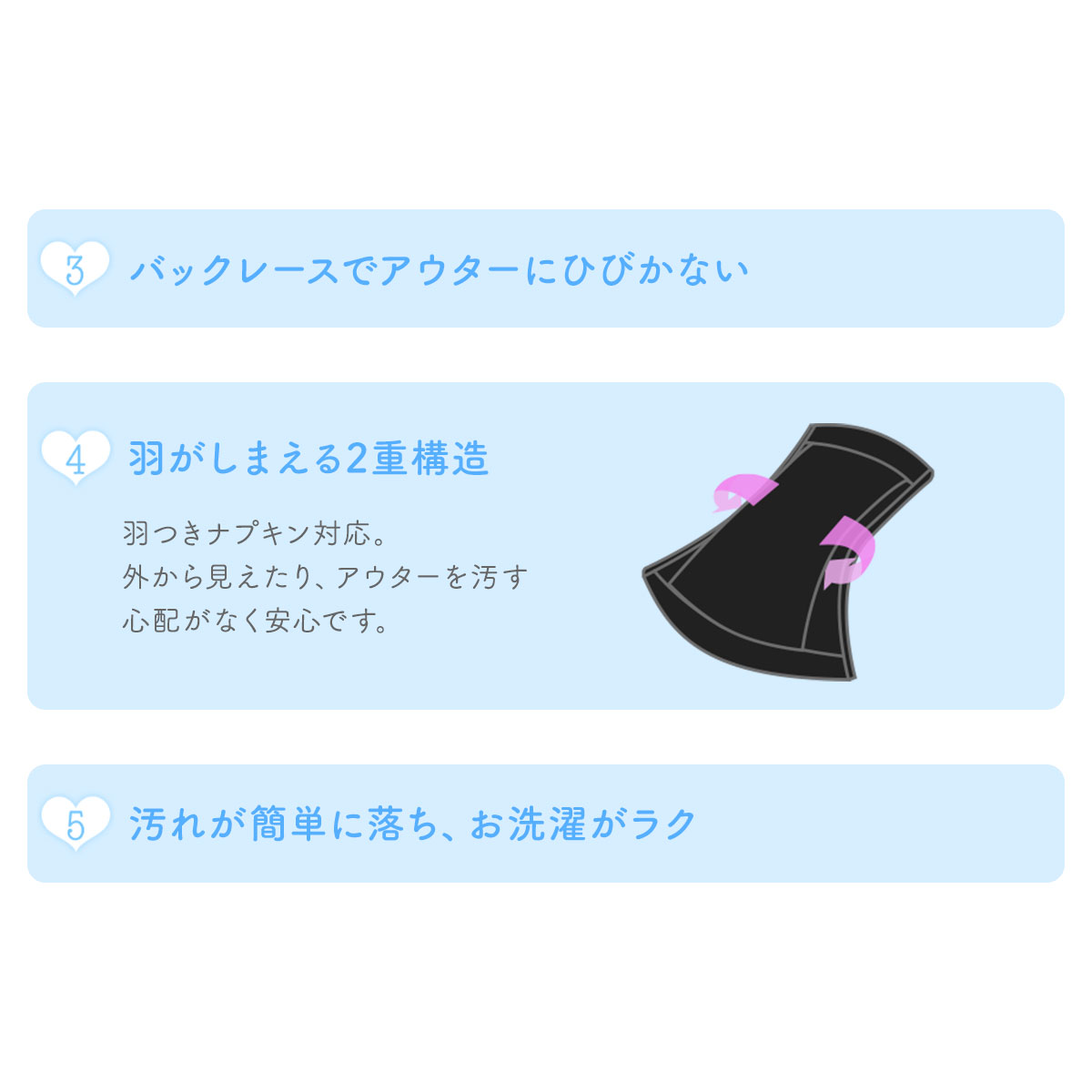 羽がしまえる二重構造のクロッチで羽根つきナプキンにも対応。外から見えたり、アウターを汚す心配がなく安心です。汚れが簡単に落ち、お洗濯がラクなのも嬉しいポイント☆