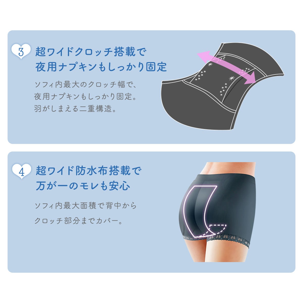 夜用ナプキンサイズの超ワイドクロッチで、夜用ナプキンもしっかり固定。クロッチのナプキン取付ガイドに合わせることで、長い夜用ナプキンでもズレずにぴったり装着することができます。ソフィ内最大面積の超ワイド防水布で広い範囲をカバーし、万が一のモレも安心です。