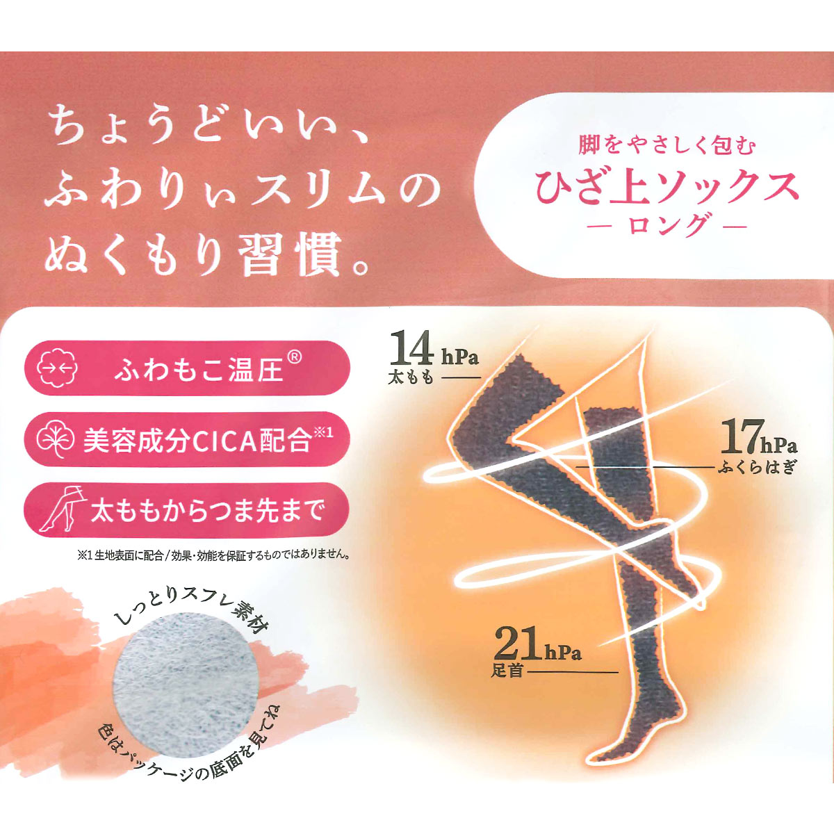 | 仕 様 | ・ひざ上丈 ・ふわもこ温圧(足首21hPa ふくらはぎ17hPa 太もも14hPa) ・CICA配合 ※「お取り扱いの注意」「使用上の注意」をよく読み、お使いください。