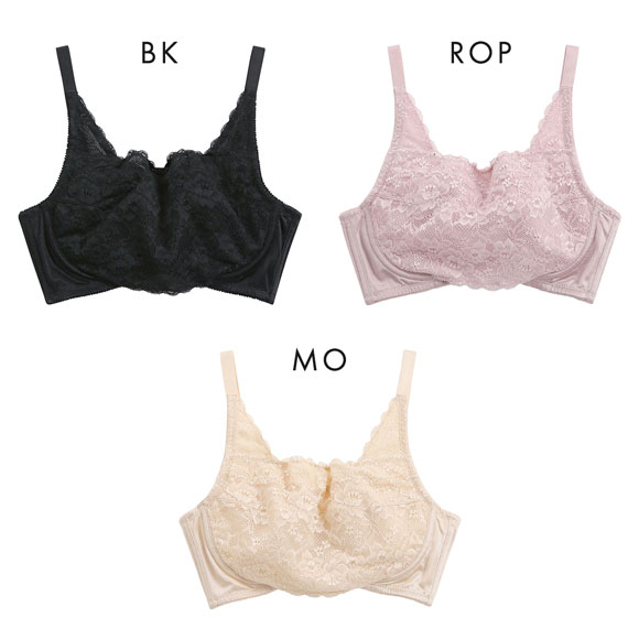見えてもOKなレースデザインで胸元をカバーし、気になる谷間のちら見えも防止。かわいいお洋服をすっきりスマートに着こなせる、大きなサイズさんのためのブラジャーです。