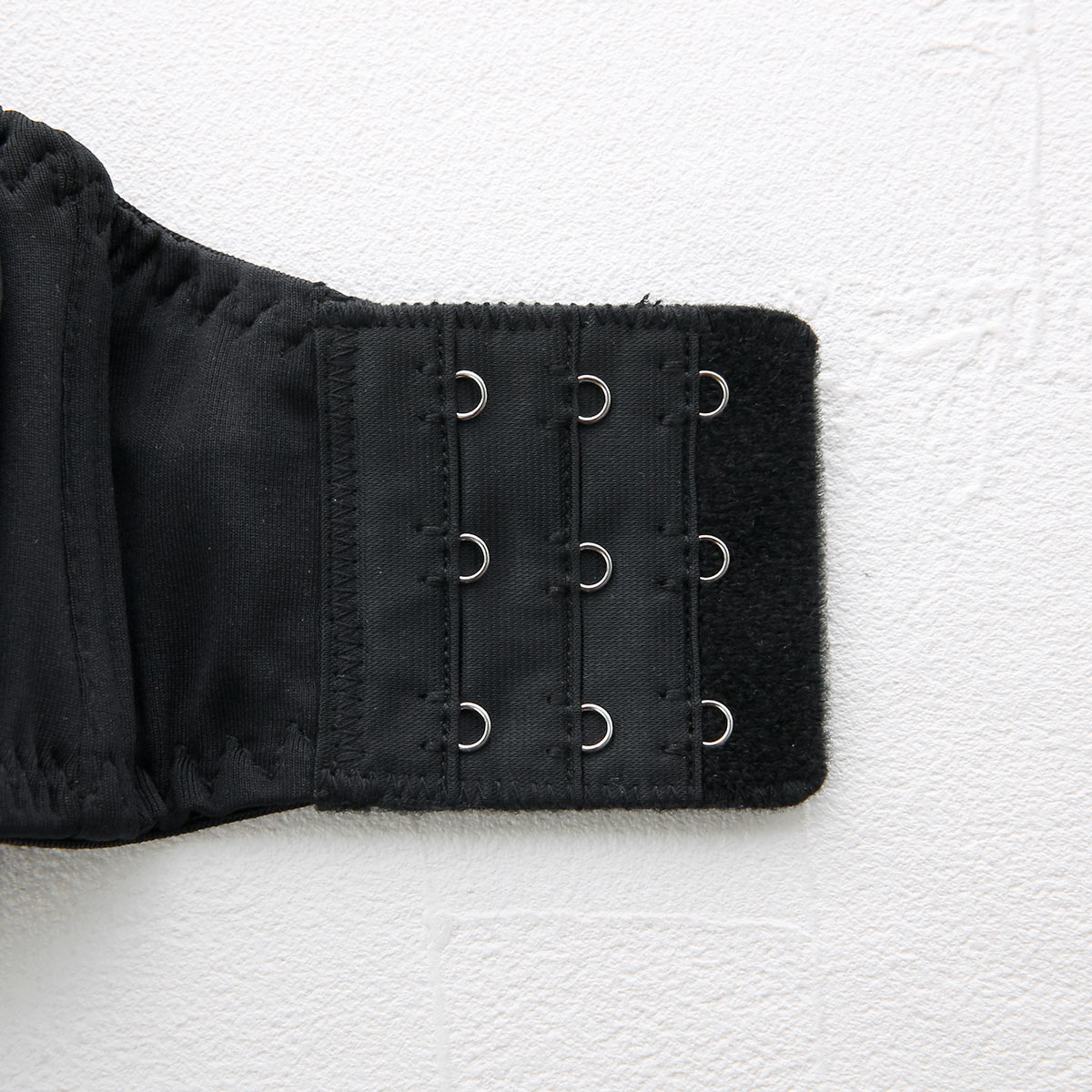 背中側には3段3列のホック付きなので、よりフィット感を高めることができます。さらに、脇下部分に滑りにくい生地を使用しているため、ズレにくくなっています。