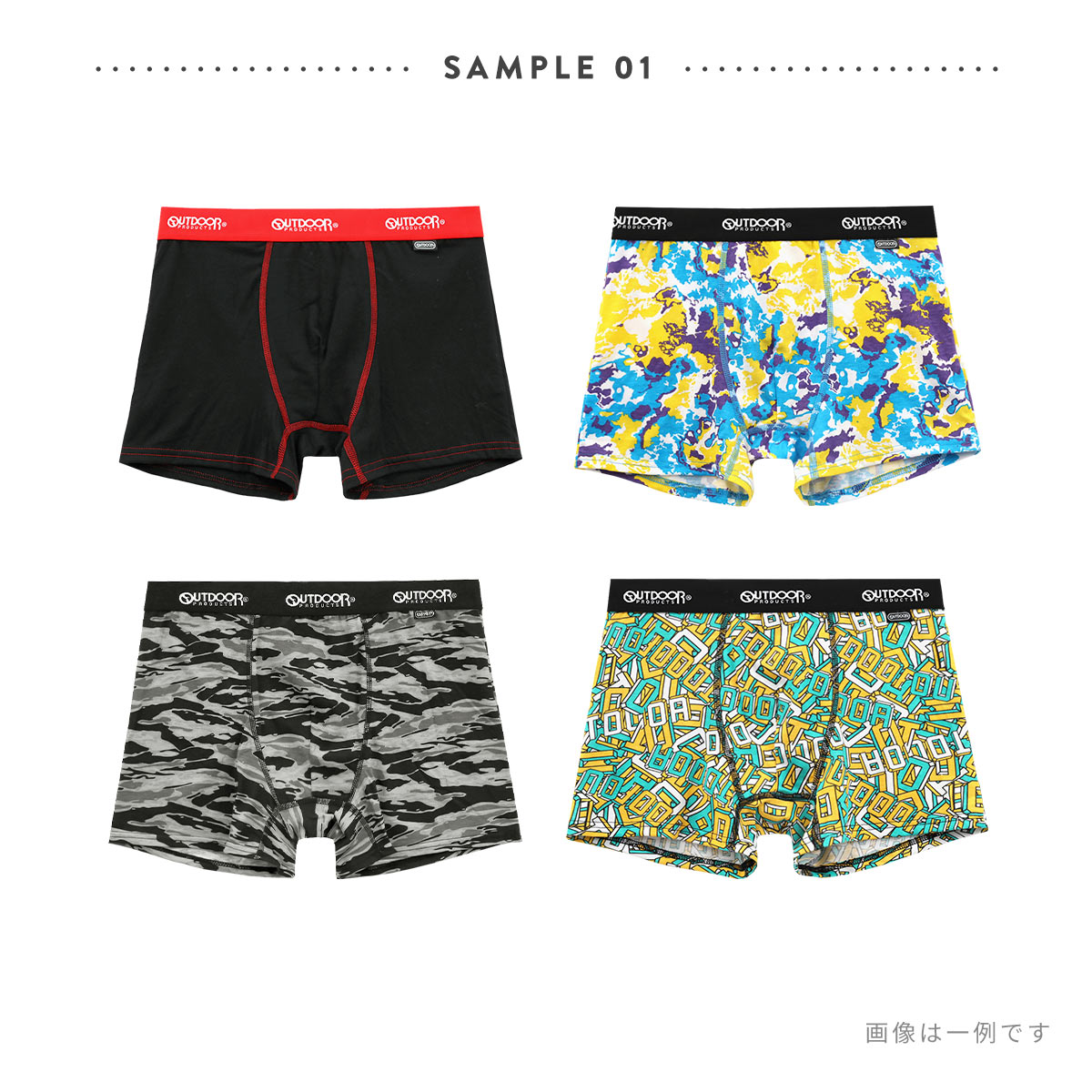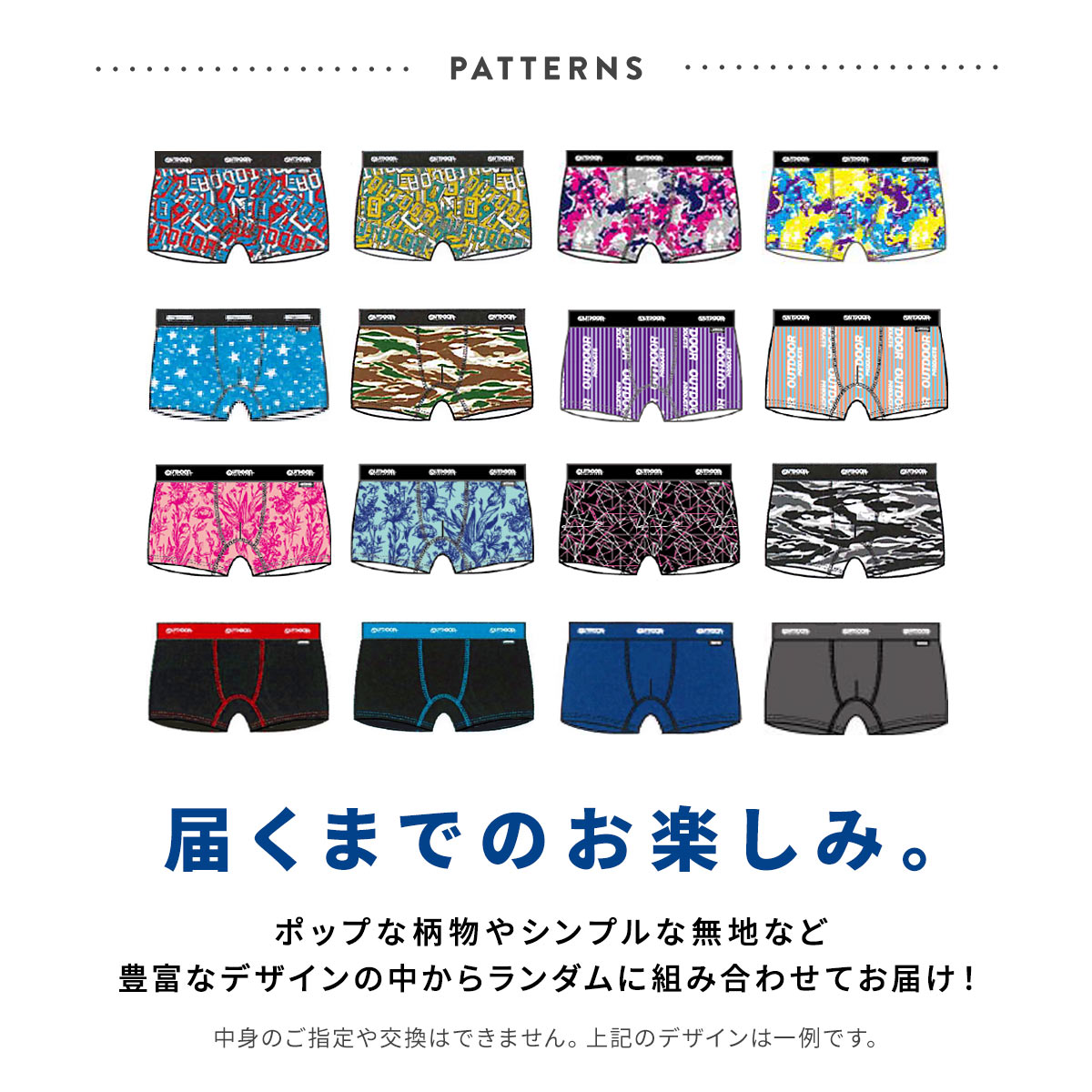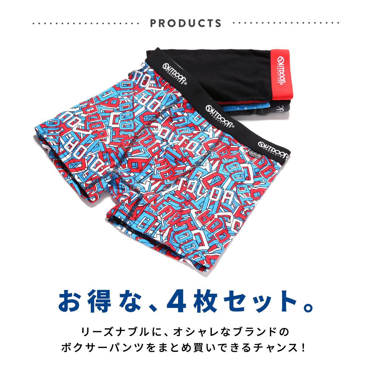 カジュアルなプリントボクサーから、ベーシックなソリッドボクサーまで、何が入っているかは届いてからのお楽しみ♪ウエストゴムには、どのアイテムにもOUTDOORのロゴ入りなので、チラッと見えてもオシャレです。4枚入ってこの価格というのもうれしいポイントです!