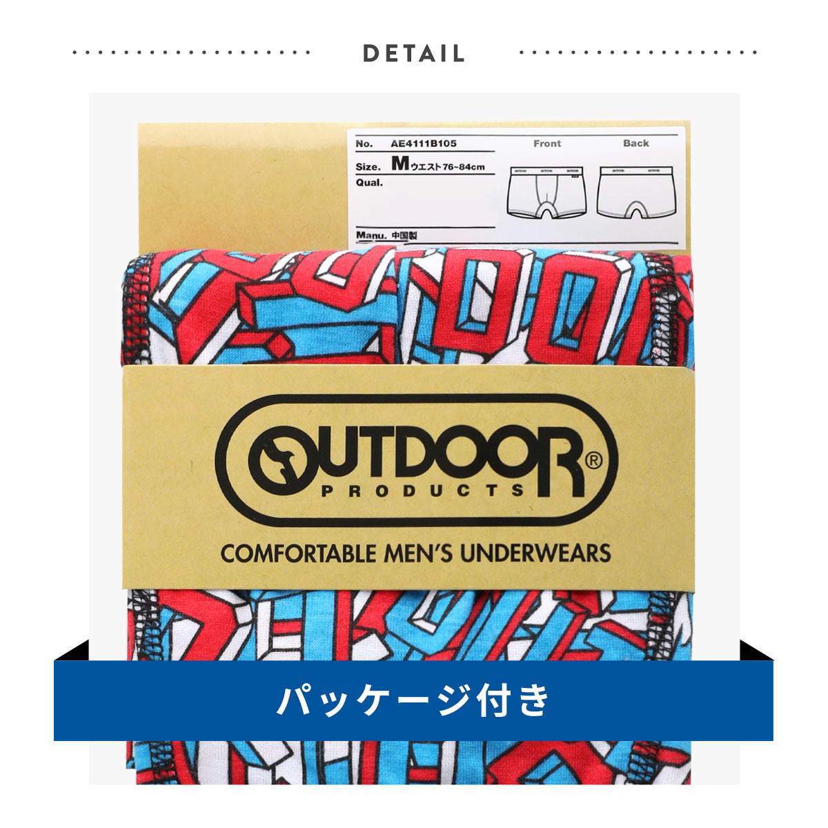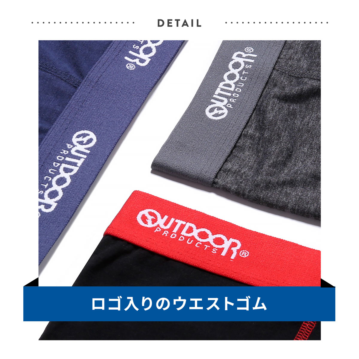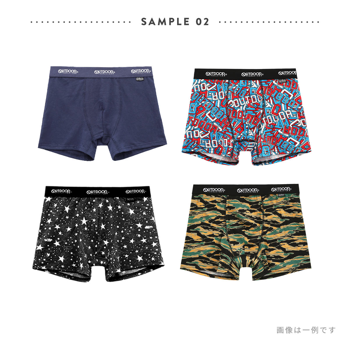 カジュアルなプリントボクサーから、ベーシックなソリッドボクサーまで、何が入っているかは届いてからのお楽しみ♪ウエストゴムには、どのアイテムにもOUTDOORのロゴ入りなので、チラッと見えてもオシャレです。4枚入ってこの価格というのもうれしいポイントです!