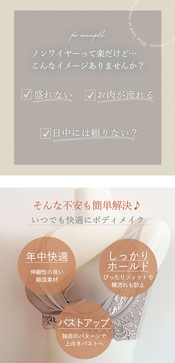 楽な着心地とバストアップを両立!理想のバストラインをメイクするノンワイヤーブラです。