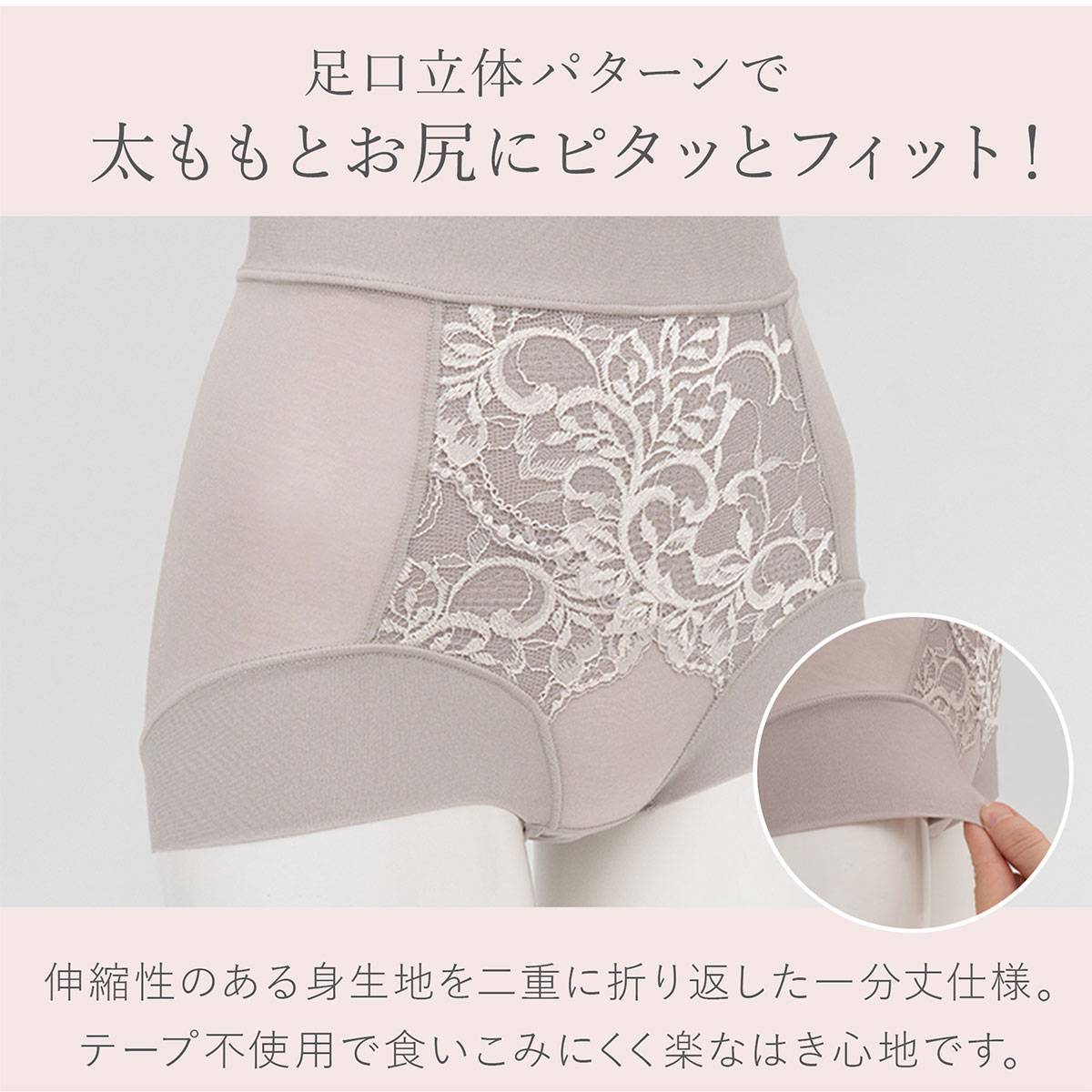 フロント下腹周りは、身生地・ストレッチレース・パワーネットの三重構造で、効果的にお腹を押さえ、すっきりフラットに整えます。またウエストと足口は、ゴムを使用せずに生地を二重に折り返した「わさ仕様」のため、食い込みや締め付け感を軽減。一分丈で、太ももとお尻にピタッとフィットする立体パターンです。