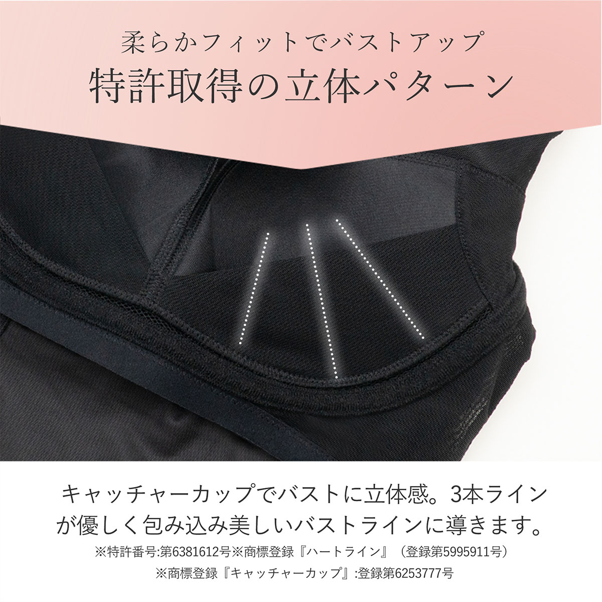 ブラデリス独自の立体設計パターンと特許取得の「キャッチャーカップ」が、ノンワイヤーでありながら、まるでワイヤーブラのような高い補整力で、バストを立体的に包み込み、本来あるべき美しい位置「ゴールデントライアングル」へと導きます。