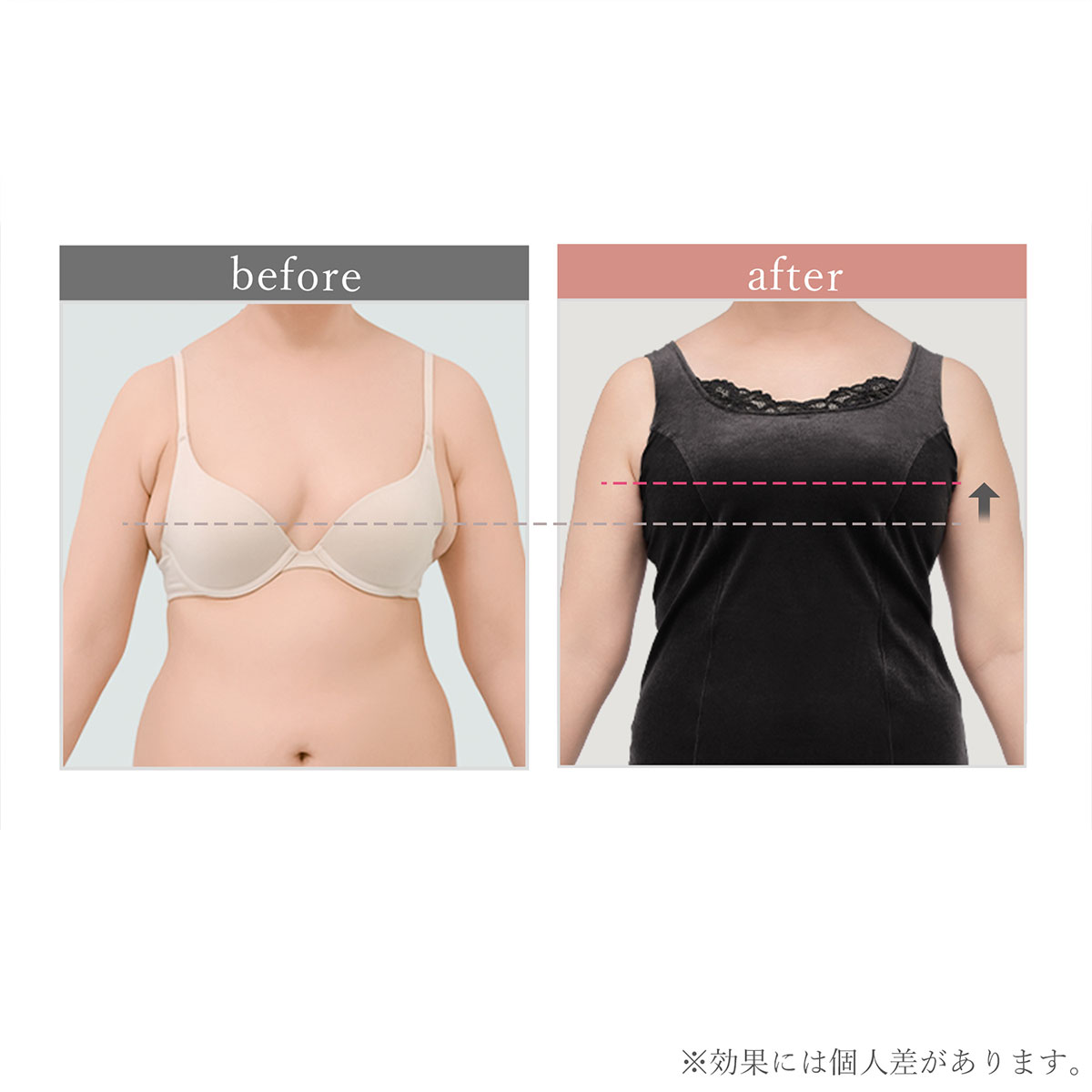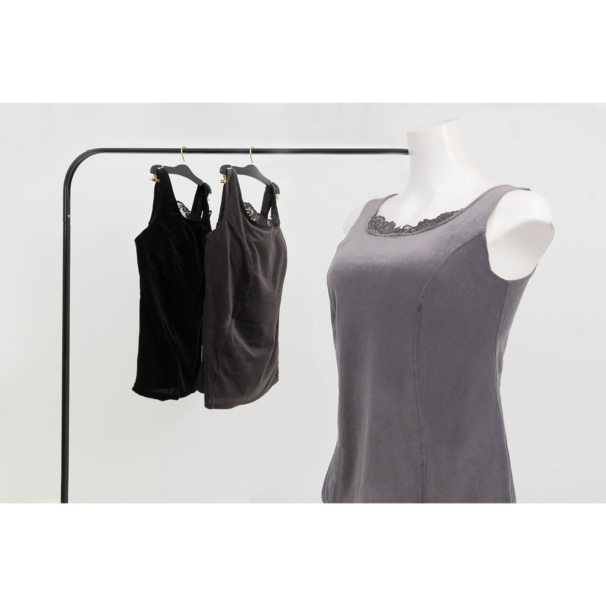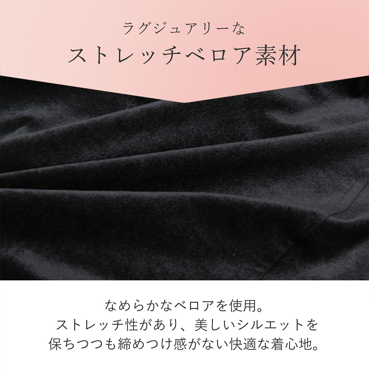 身生地に艶やかな光沢を放つストレッチベロア素材を贅沢に使用した、高級感のあるデザイン。ボディラインに美しく沿うビスチェ風の切り替えと繊細なレースのあしらいで、インナーとしてだけでなく、ジャケットやカーディガンを羽織って見せるコーディネイトもおすすめです。