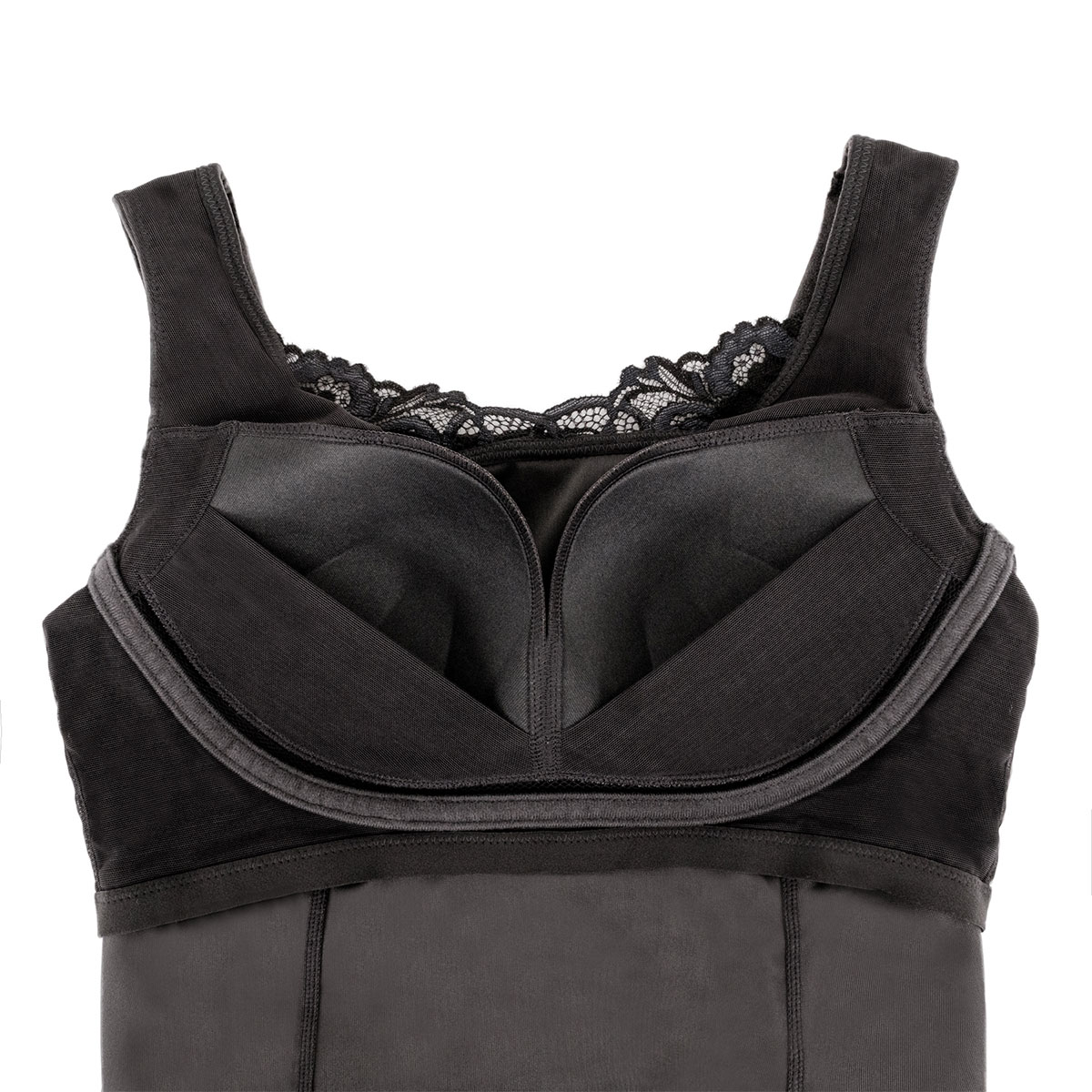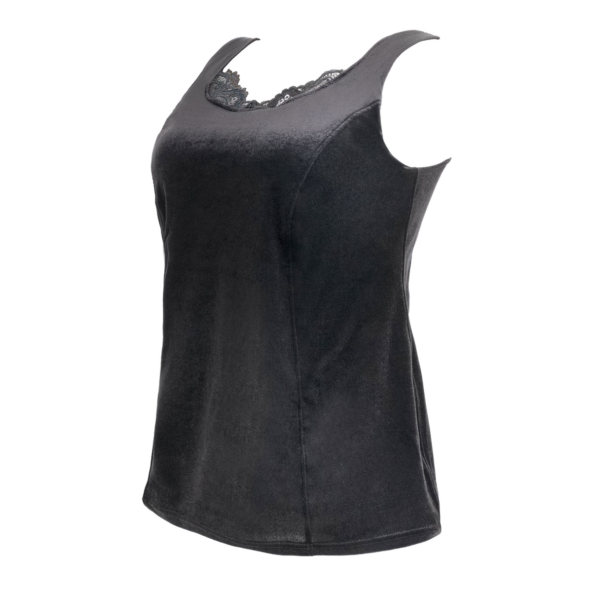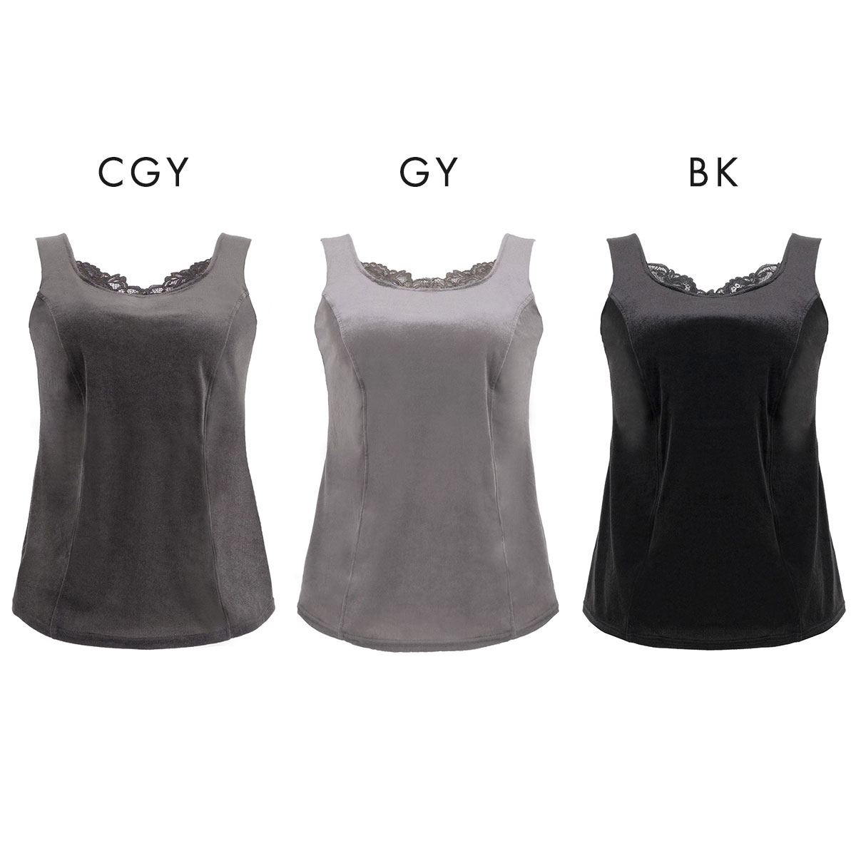 身生地に艶やかな光沢を放つストレッチベロア素材を贅沢に使用した、高級感のあるデザイン。ボディラインに美しく沿うビスチェ風の切り替えと繊細なレースのあしらいで、インナーとしてだけでなく、ジャケットやカーディガンを羽織って見せるコーディネイトもおすすめです。