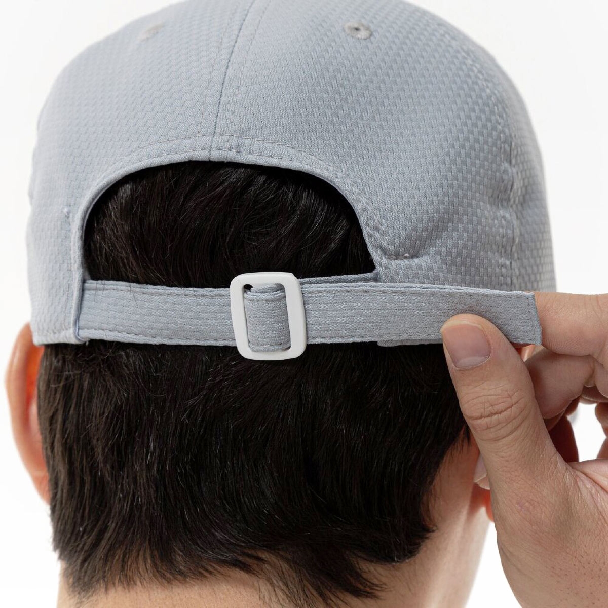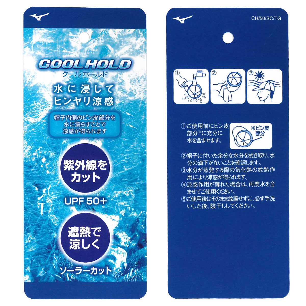 クールホールドとは、水を含ませると、水分の気化熱の放熱作用で涼しさを感じられる機能。帽子の内側のおでこがあたる部分のテープを水に濡らすことで、ヒンヤリ涼感が得られます。