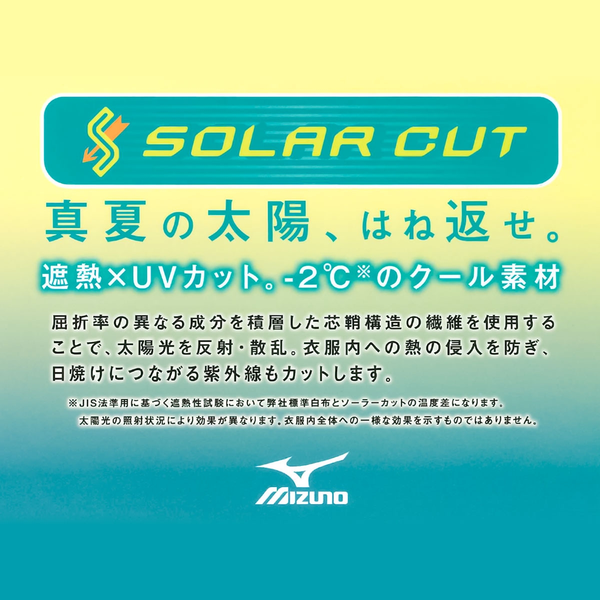 遮熱性のあるソーラーカット素材が太陽光を反射・散乱。熱の侵入を防ぎ、衣服内の温度上昇を約2℃抑え、クールに保ちます。日焼けに繋がる紫外線の透過を抑制してくれるので、うっかり日焼け防止にも。夏場のスポーツシーンやレジャーの心地よさをサポートします。