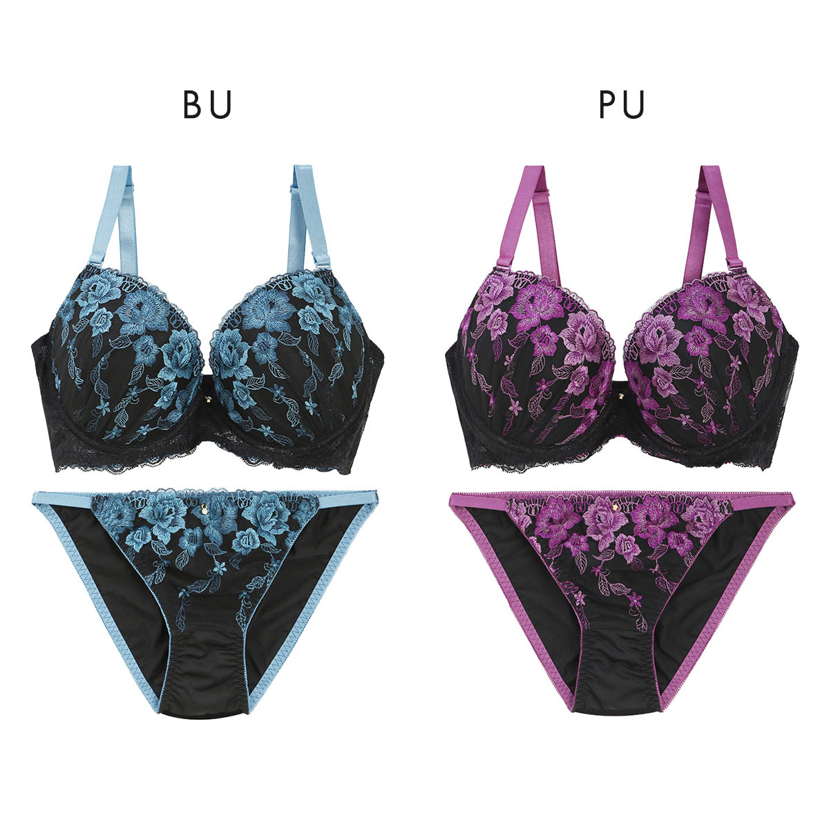 エレガント 脇肉を谷間に変える脇高ブラ フラワー刺繍レース ブラセット GHI65-95 グラマー ブラジャー ショーツ セット Elegante(BU-ブルー-G65-M)