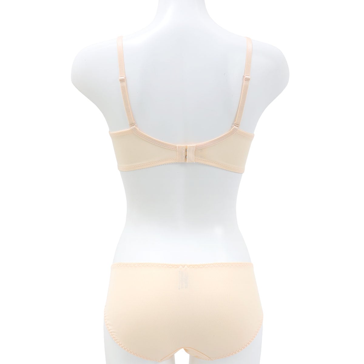 ブラは脇肉を谷間に変える脇高設計。脇に高さのあるL字のカップラインが、寄せたバストボリュームを逃さず谷間をキープし、気になる脇肉もすっきりカップイン。薄くて軽いもっちり触感のモールドカップが、やわらかくバストにフィットし、つけるだけで自然な丸みの美胸シルエットを演出します。
