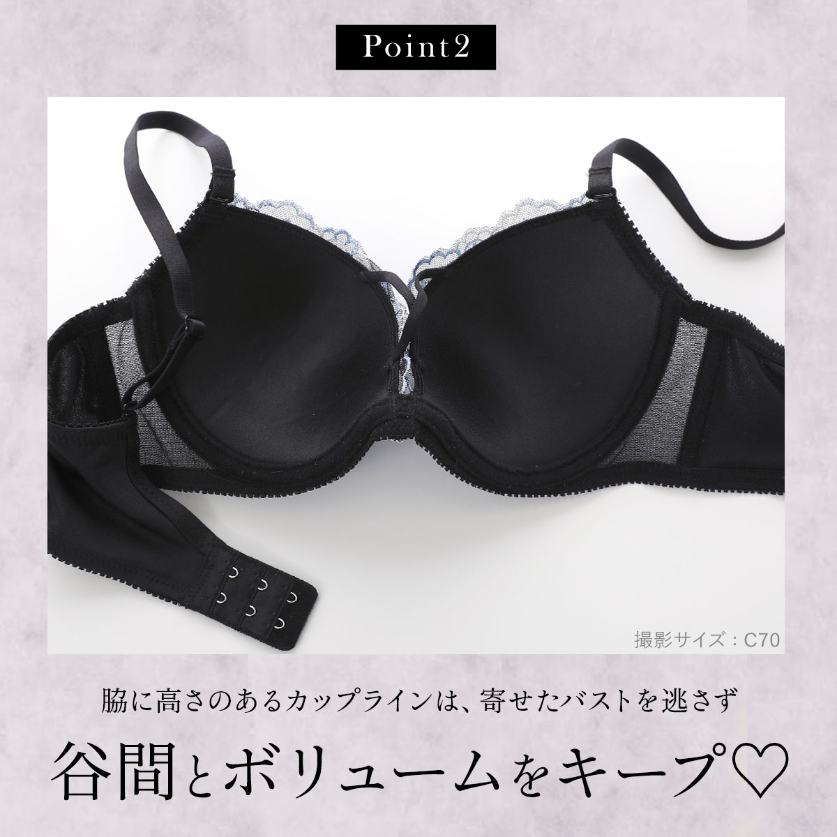 カップ脇は伸びない素材の裏打ちとサイドボーンが、寄せ集めたバストボリュームをしっかり支えて谷間をキープ!さらに、背中に段ができにくいU字のバックラインで後ろ姿もすっきりなめらかに整えます。