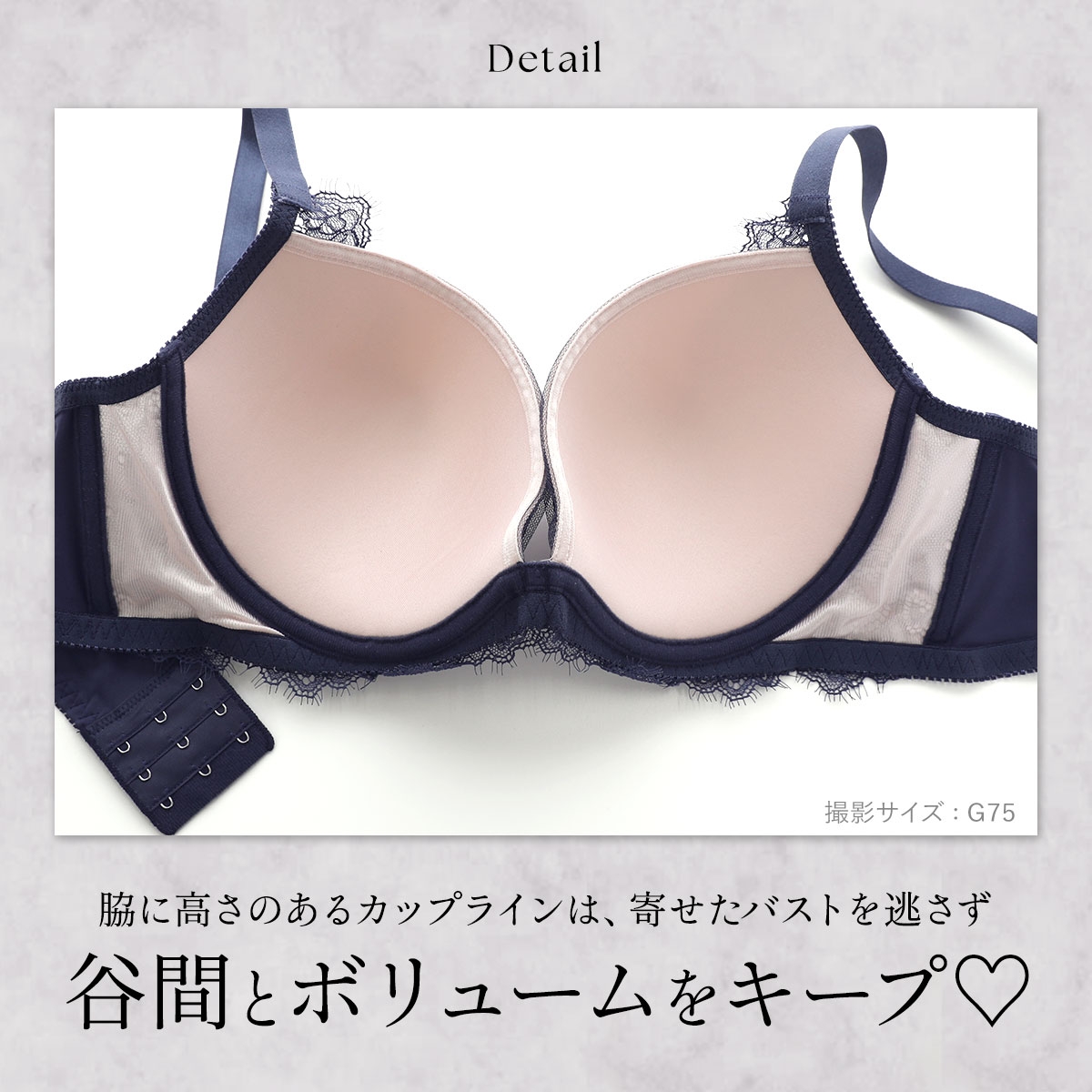 ブラは脇肉を谷間に変える脇高設計。脇に高さのあるL字のカップラインが、寄せたバストボリュームを逃さず谷間をキープし、気になる脇肉もすっきりカップイン。薄くて軽いもっちり触感のモールドカップが、やわらかくバストにフィットし、つけるだけで自然な丸みの美胸シルエットを演出します。