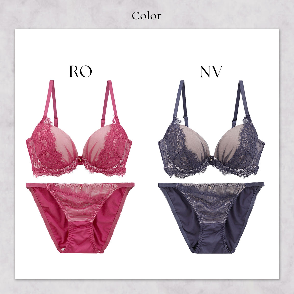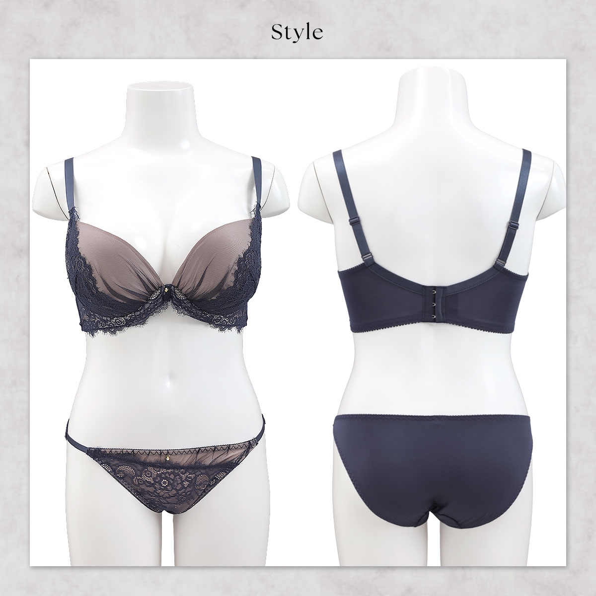 繊細なアイラッシュレースとシアーな透け感の大人っぽいチュールレースがシンプルながらも華やかな印象。単色レースで品よく仕上げています。胸中心にはジュエルチャームが華やぎを添えます。