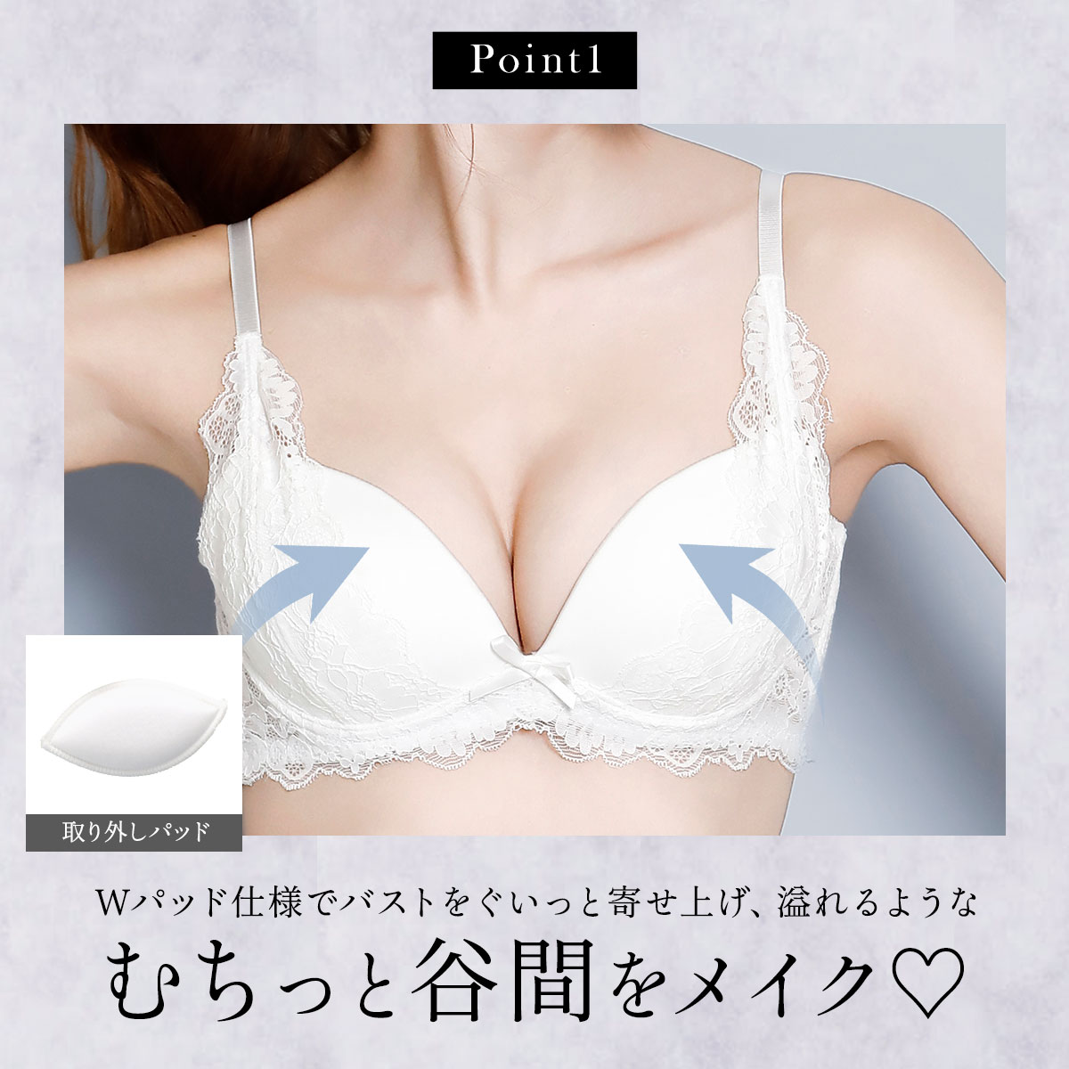 もっちり下厚のモールドカップ+取り外し可能なレモンパッドのWパッド仕様でバストをぐいっと寄せ上げ、むちっと溢れるような谷間をメイクします。