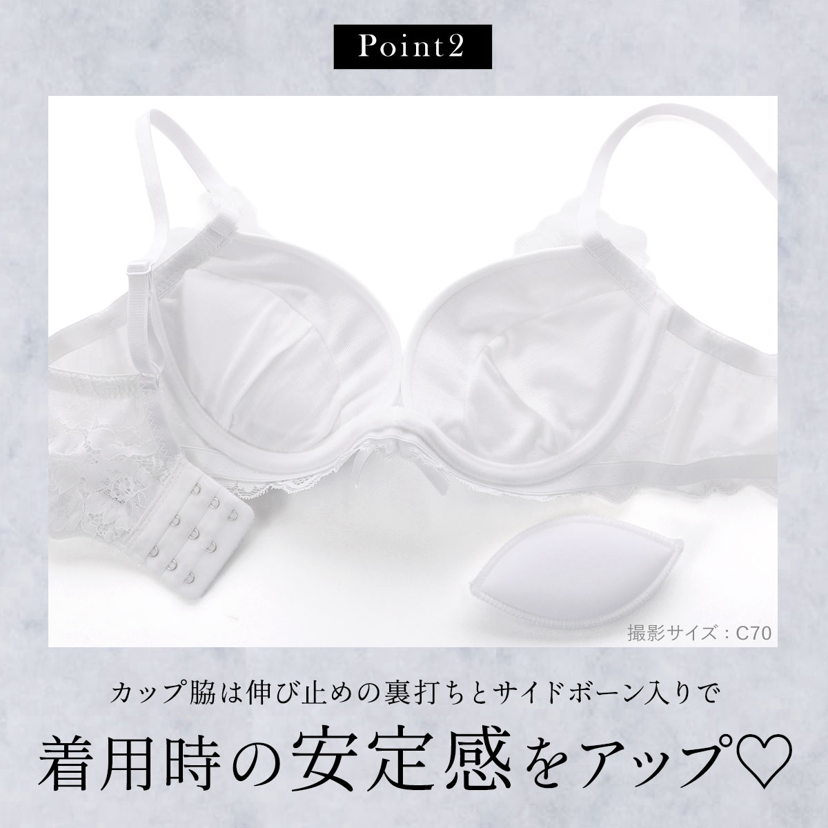 カップ脇は伸びない素材の裏打ちとサイドボーンで、着装時の安定感を高めています。バックは幅広チュールパワーネットにレースを重ねたW使いで、段差を軽減しながらしっかりと安定感のあるつけ心地です。