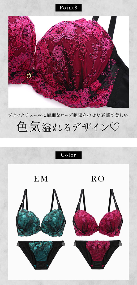 ブラックチュールに繊細なローズ刺繍をのせた豪華で美しいデザイン。ぼんやり暗闇から浮かび上がるような深いカラーリングで、肌映えもばっちり!