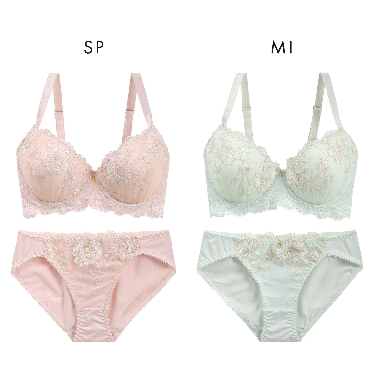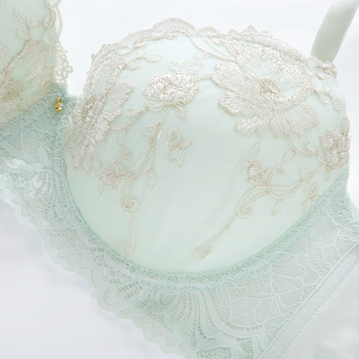 泡雪のように軽やかで繊細なフラワー刺繍レースが、肌の上でしゅわっと溶け込むような、優しいレースデザイン。ジュエルチャームが煌めきを添えるアクセント。