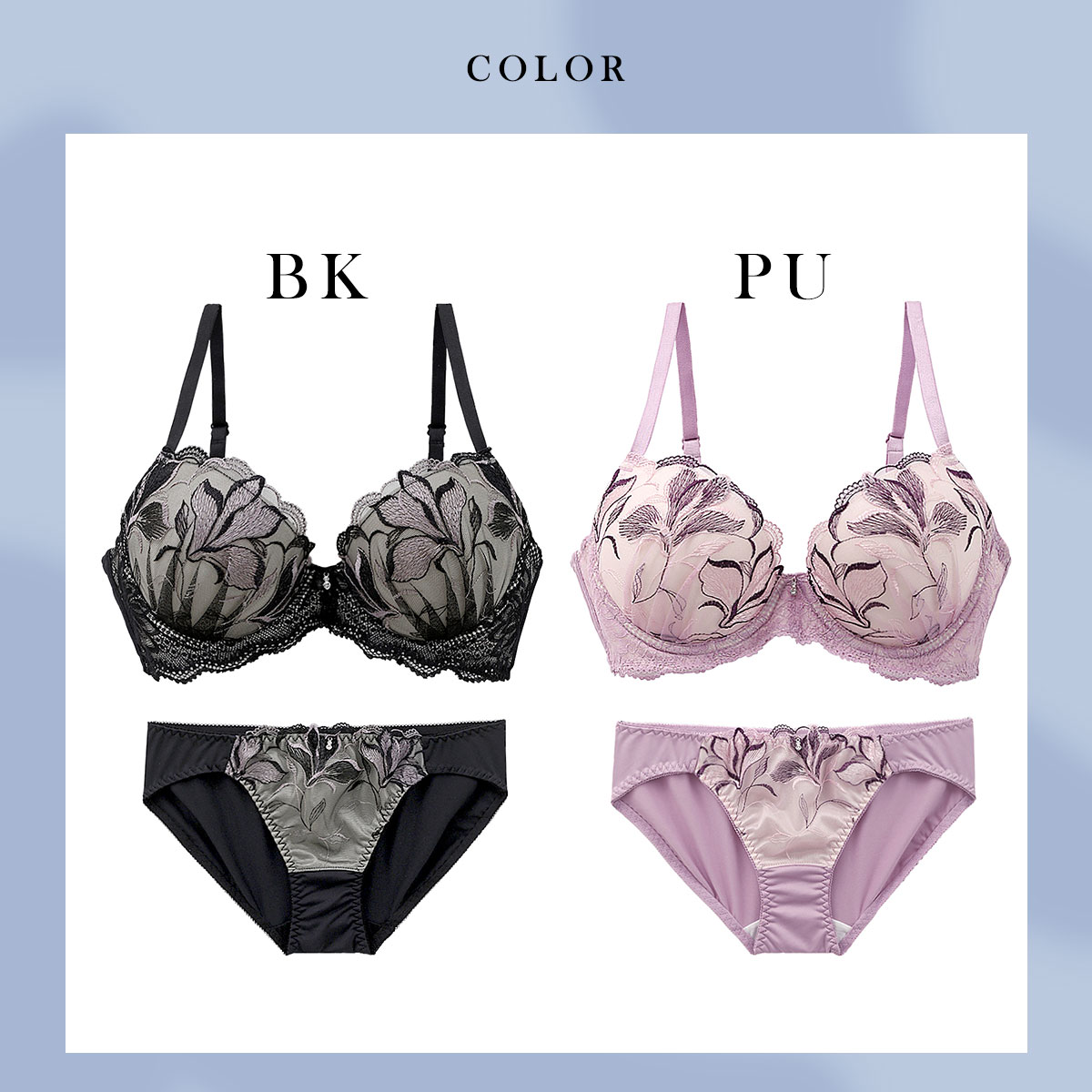 気品高いユリの刺繍が美しく花ひらく、優雅でエレガントなデザイン。胸中心にはジュエルチャームが上品な輝きを添えます。