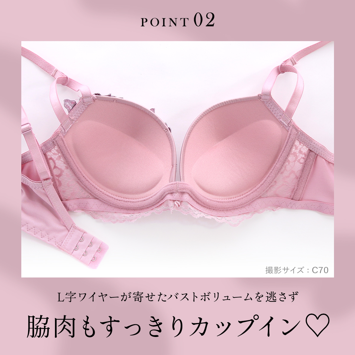 ブラは脇肉を谷間に変える脇高設計。もっちり下厚のモールドカップがバストを底から押し上げ、ふっくら美谷間をメイク。脇に高さのあるL字のカップラインが寄せたバストボリュームを逃さず、気になる脇肉もすっきりカップイン。
