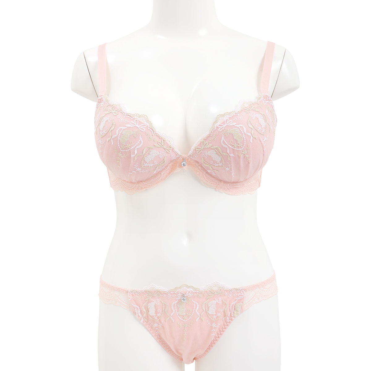 愛らしいうさぎとリボンのモチーフをきらめくゴールドのラメ糸で描いた、ロマンティックでキュートなブラセット。胸中心にはムーンクォーツのようなチャームが輝きを添えます。