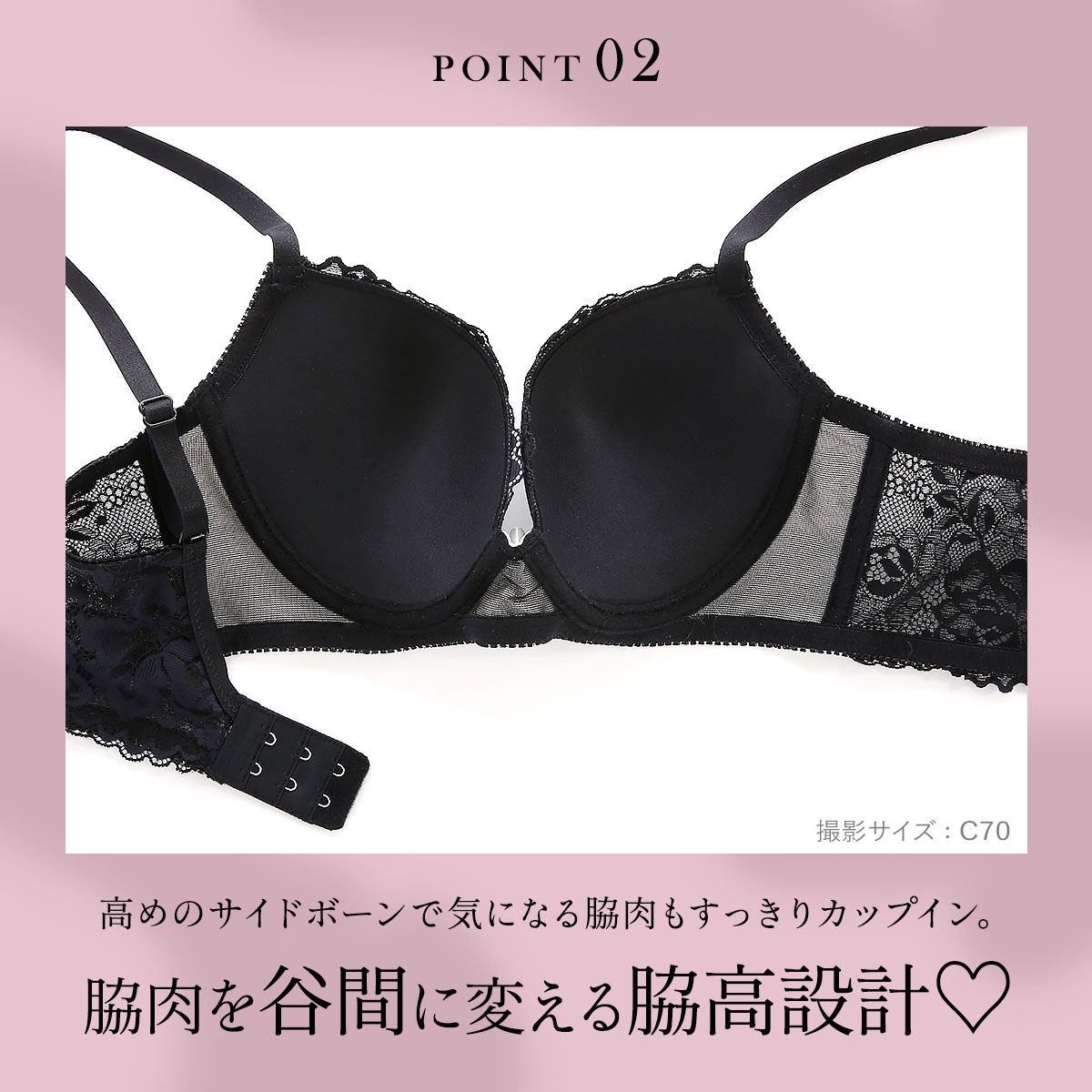 ブラジャーは脇肉を谷間に変える脇高設計。高めのサイドボーンで気になる脇肉もすっきりカップイン。薄くて軽いもっちり触感のモールドカップを使用しているので、つけるだけで自然な丸みが綺麗なバストシルエットをメイクしてくれます。