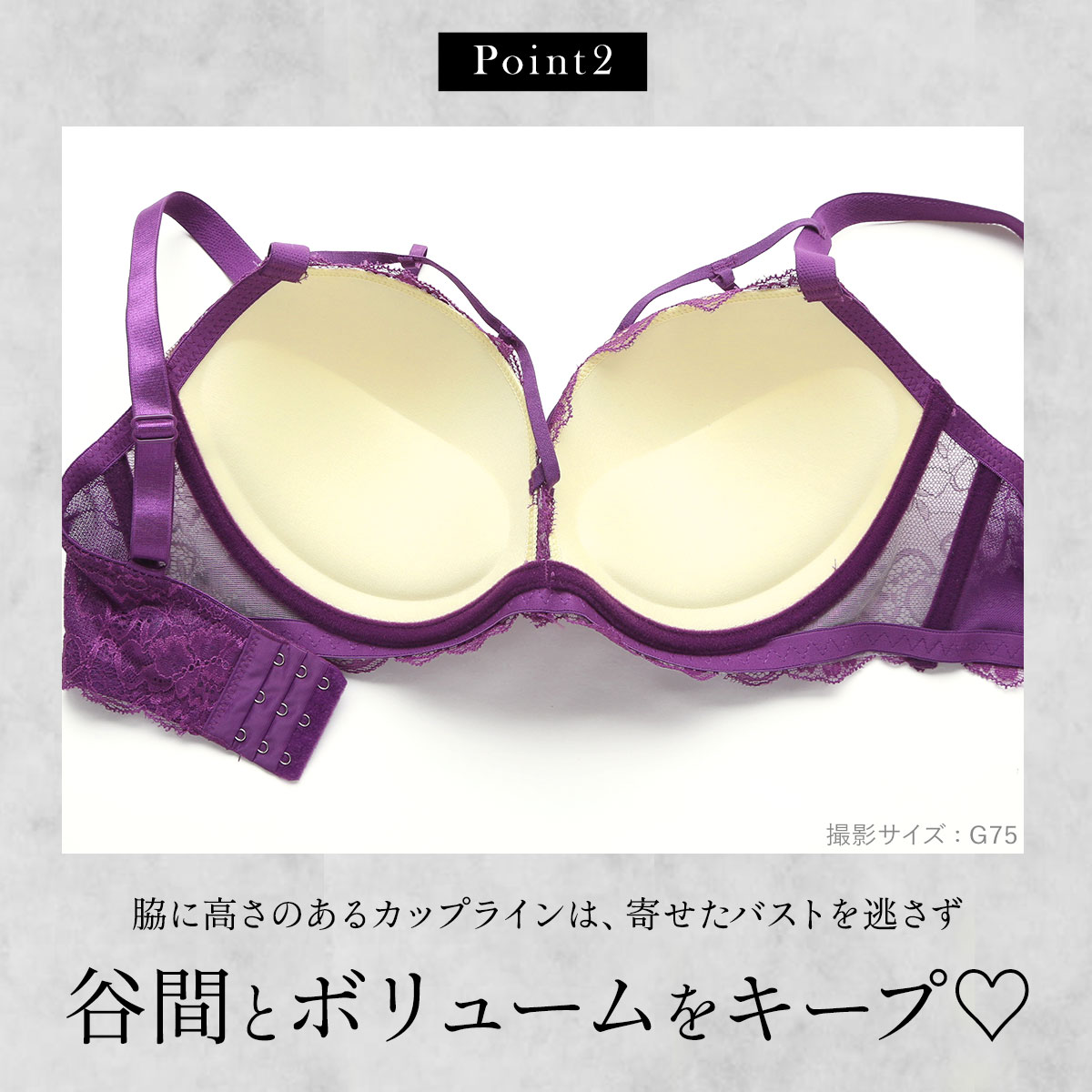 | 仕 様 | ブラ ・3/4カップ ・ホックの数:3段3列 ・下厚モールドカップ(パッドなし・パッドポケットなし) ・肩紐取外し:不可 ・L字ワイヤー入り ・サイドボーン:あり