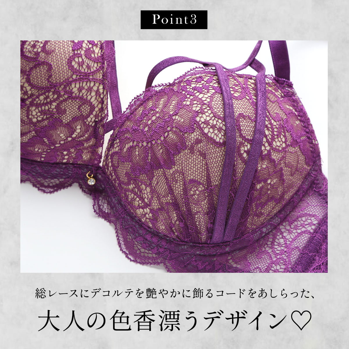 繊細な総レースにデコルテを艶やかに飾るコードをあしらった、エッジの効いたデザインが目を引くブラセット。いつものランジェリーにセンシュアルなエッセンスをプラスした、大人の色香漂うデザインです。