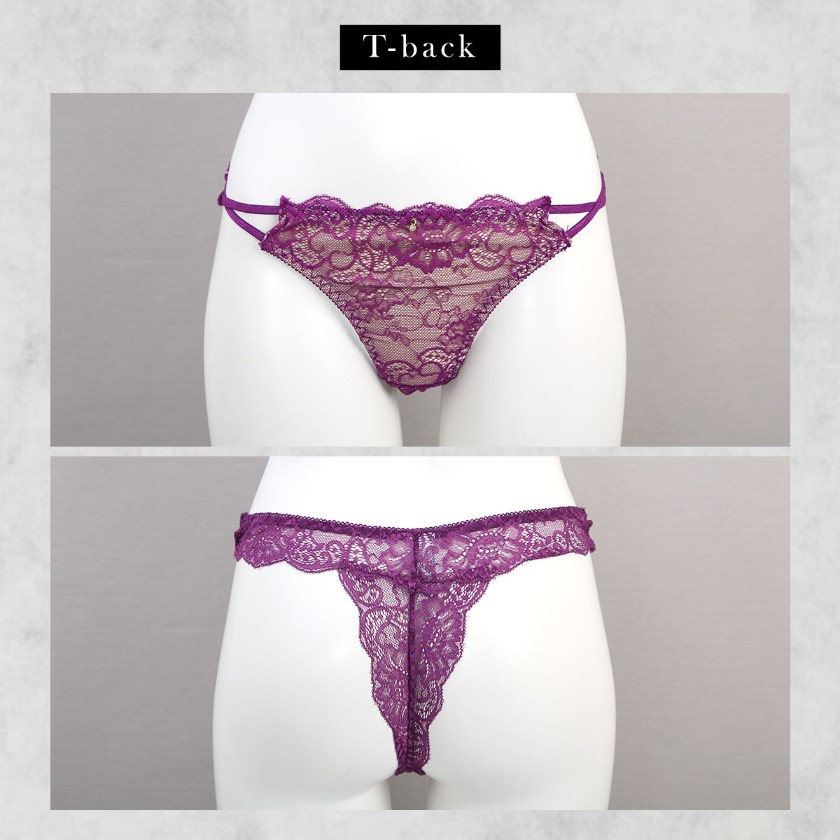 ショーツはデイリーに使いやすいノーマルと、アウターにひびきにくいTバックの2タイプがセット。サイドのクロスコードがセンシュアルなアクセントに。セットショーツは、ほんのり透けて見える素肌がSexyなバック総レース仕様。やわらかなストレッチレースを使用しているので、ヒップに程よくフィットしはき心地も快適です。
