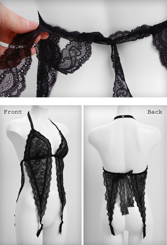肌にぴったりと沿うレースがボディラインを強調する、誘惑的でセクシーなデザイン。リボンを結ぶバックスタイルで、さらに女らしさをアップさせます。ホルターネックはアジャスターつきで、長さを調整できます。