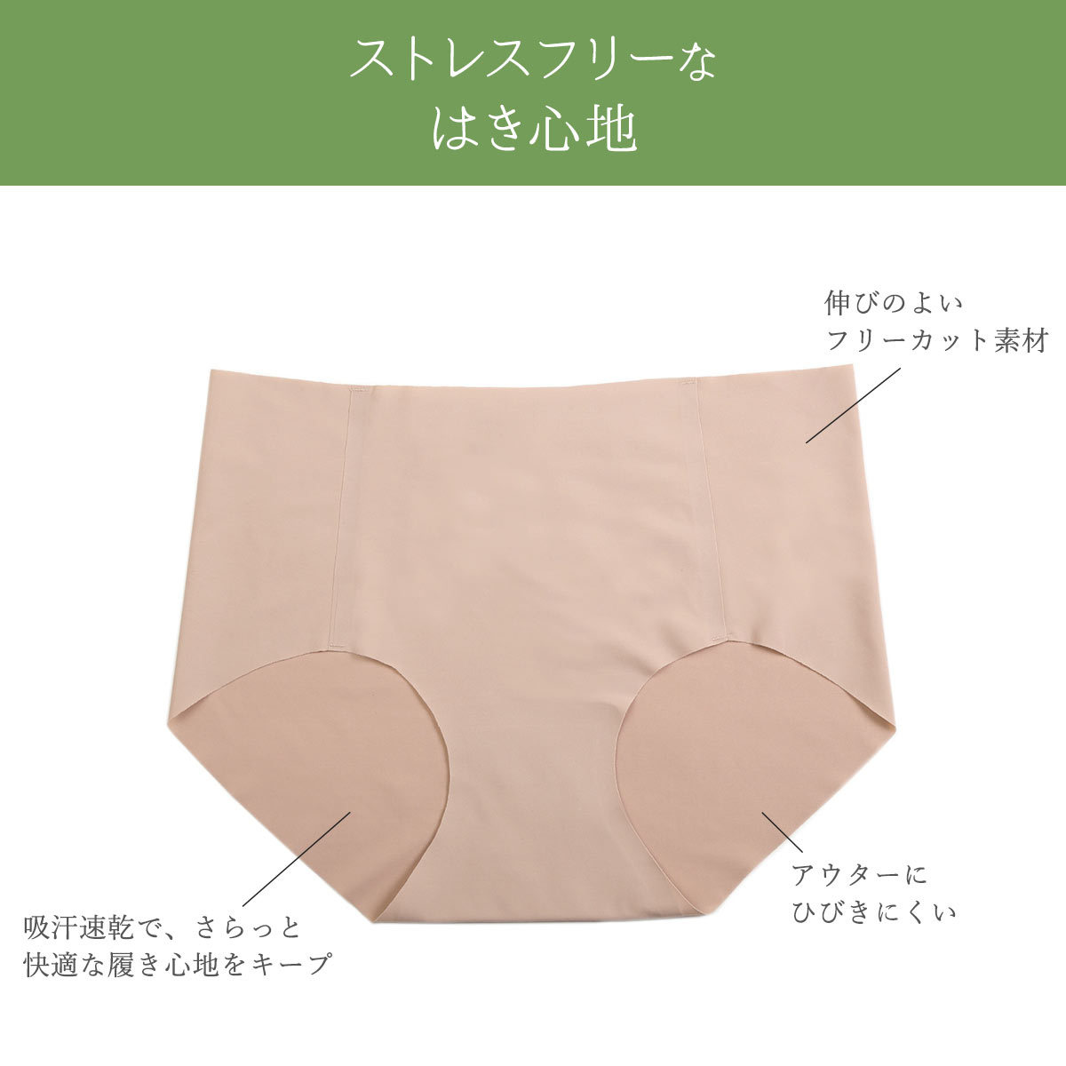 伸びのよいフリーカット素材でストレスフリー!補強のための最小限の縫い目でゴムがなく、締め付け感のないリラックスフィット。アウターにひびきにくいので、パンツスタイルにもおすすめです。さらっと快適な吸汗速乾加工。肌にやさしいタグレス(洗濯表示直接プリント)仕様。